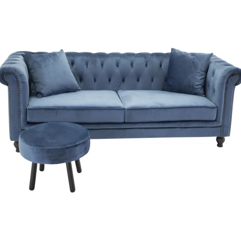 Kombinér moderne design med traditionelt håndværk og dekorer dit hjem med et dristigt farveklik! Velvet er en stilfuld sofaserie i Chesterfield-design med lækkert fløjlstof og dekorative dybdeknapper. Denne rummelige og komfortable 3 personers sofa med lige design og blåt fløjl skaber en kunstnerisk og smuk følelse i dit hjem. De rustikke træsofabben bidrager til sofaens elegante design og moderne udseende. Pop hverdagen med denne lækre sofa i stuen! Plejeråd: Fløjl har tendens til at få trykmærker, når bunken lægger sig. Aftrykkene kan få stoffet til at se slidt ud, hvilket er helt normalt for denne type materiale. Afhængig af hvordan lyset falder, kan stoffet skifte i forskellige nuancer.
