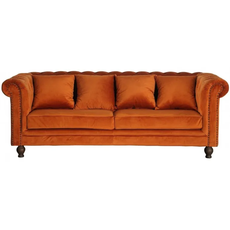 Dekorer dit hjem med en modig farveklik og et håndværk med tradition! Den klassiske Chesterfield sofa har et håndværk, der er arvet fra generation til generation. Velvet er en stilfuld sofaserie i Chesterfield-design med lækkert fløjlstof og dekorative dybdeknapper. Denne rummelige og komfortable 3 personers sofa med lige design og lækkert orange fløjl giver en kunstnerisk og smuk følelse til dit hjem. De rustikke træsofabens bidrager til sofaens elegante design og moderne look. Plejeråd: Fløjl har en tendens til at få trykmærker, når bunken lægger sig. Trykmærkerne kan få stoffet til at se slidt ud, hvilket er helt normalt for denne type materiale. Afhængigt af, hvordan lyset falder, kan stoffet ændre sig i de mest forskellige nuancer.