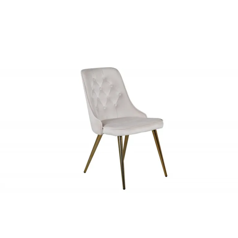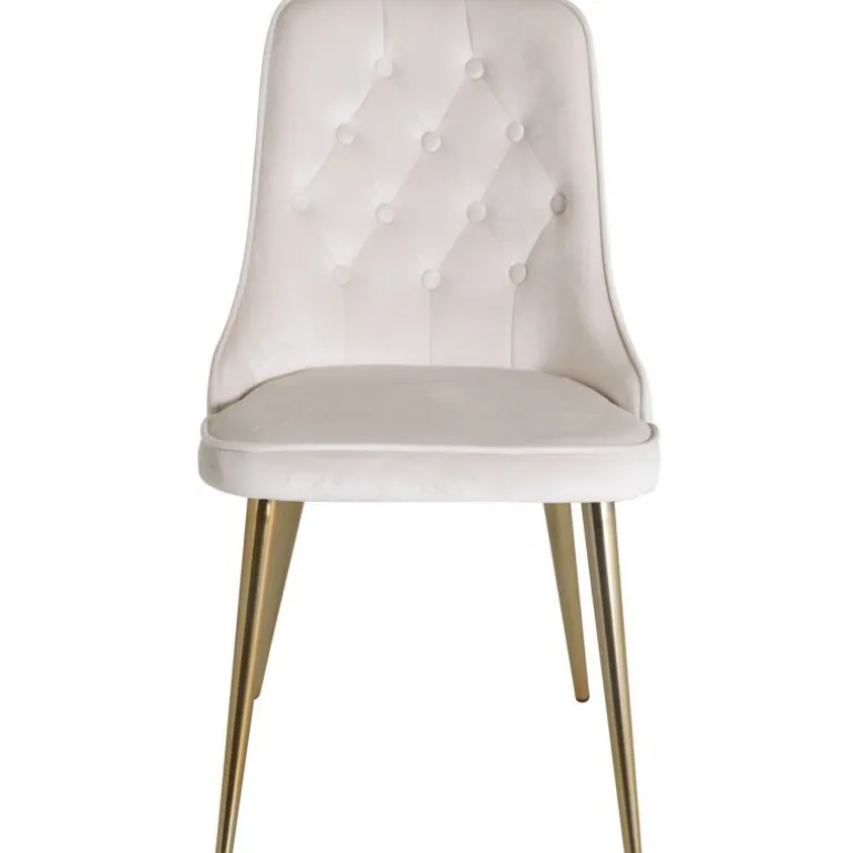 En cremehvid/beige stol fra Velvet Deluxe serien vil helt sikkert skabe en elegant blikfang i stuen! Stolen har et fuldt beklædt design i slank beige fløjlstof med knapper og dekorative stikninger i ryggen, som bliver til en fin detalje. Ben i messingbaseret metal og blød polstring i ryg og sæde for ekstra komfort. Let montering er påkrævet. Lad tiden her være dagens højdepunkt! Plejeråd: Fløjl har en tendens til at få trykmærker, når luven lægger sig ned. Aftrykkene kan få stoffet til at se slidt ud, hvilket er helt normalt for denne type materiale. Afhængigt af, hvordan lyset falder, kan stoffet skifte i de mest forskellige nuancer.