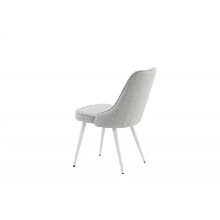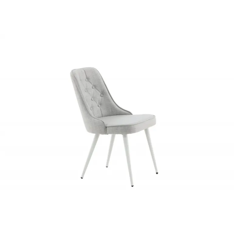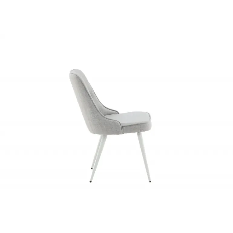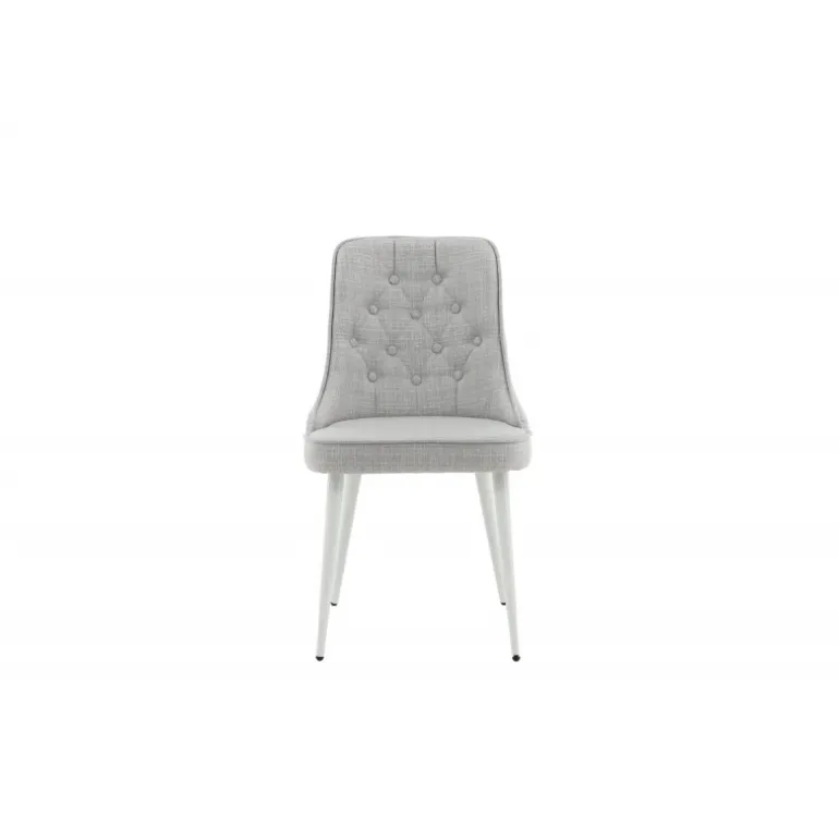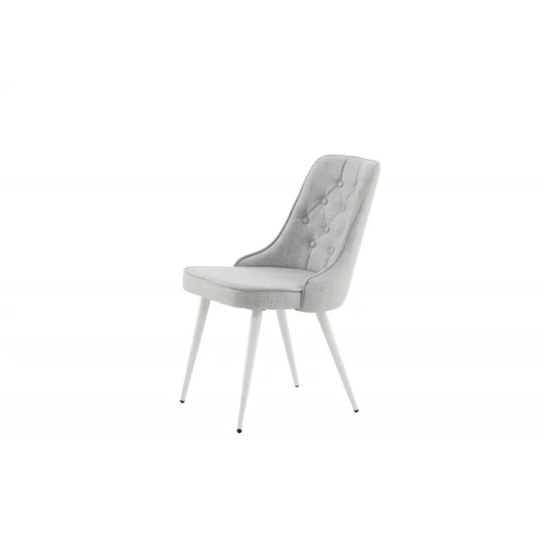 Komfortabel, stilfuld og holdbar spisebordsstol fra serien Velvet Luxury! Stolen har et fuldt beklædt design i slankt gråt polyesterstof med knapper og dekorative syninger i ryggen, der bliver til en flot detalje. Ben i hvid pulverlakeret metal og blød polstring i ryg og sæde for ekstra komfort. Lettere montering er påkrævet. Skab en pompøs blikfang i stuen! Plejeråd: Brug tekstilspray til at imprægnere tekstilet, før du begynder at bruge det, hvilket også vil gøre snavs og pletter lettere at fjerne i fremtiden. Fjern pletter med det samme, gnid ikke, men prøv at suge forsigtigt op med en klud.