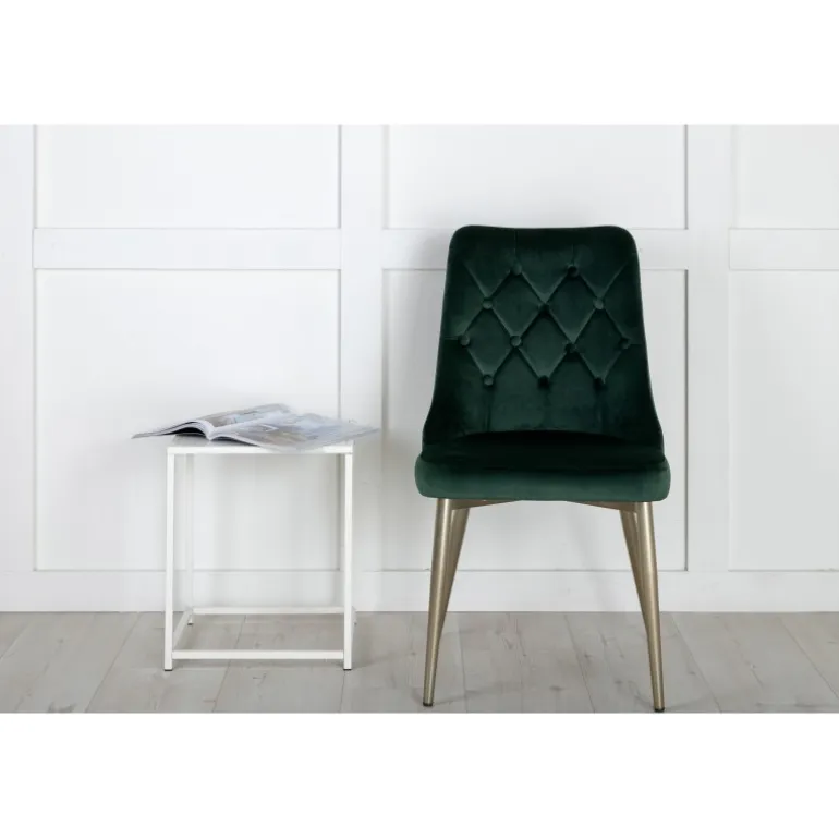Skab en pompøs atmosfære i dit hjem med et par flotte skovgrønne spisebordsstole fra serien Velvet Deluxe. Stolen har et fuldt polstret design, ben i messingpoleret metal og en rundet ryg og sæde i lækker grøn velour med blød polstring og dekorative knapper. Lige så komfortabel som iøjnefaldende! Lettere montering kræves. Plejeråd: Velour har en tendens til at få trykmærker, når luven lægger sig ned. Aftrykkene kan få stoffet til at se slidt ud, hvilket er helt normalt for denne type materiale. Afhængigt af hvordan lyset falder, kan stoffet ændre sig i de mest forskellige nuancer.