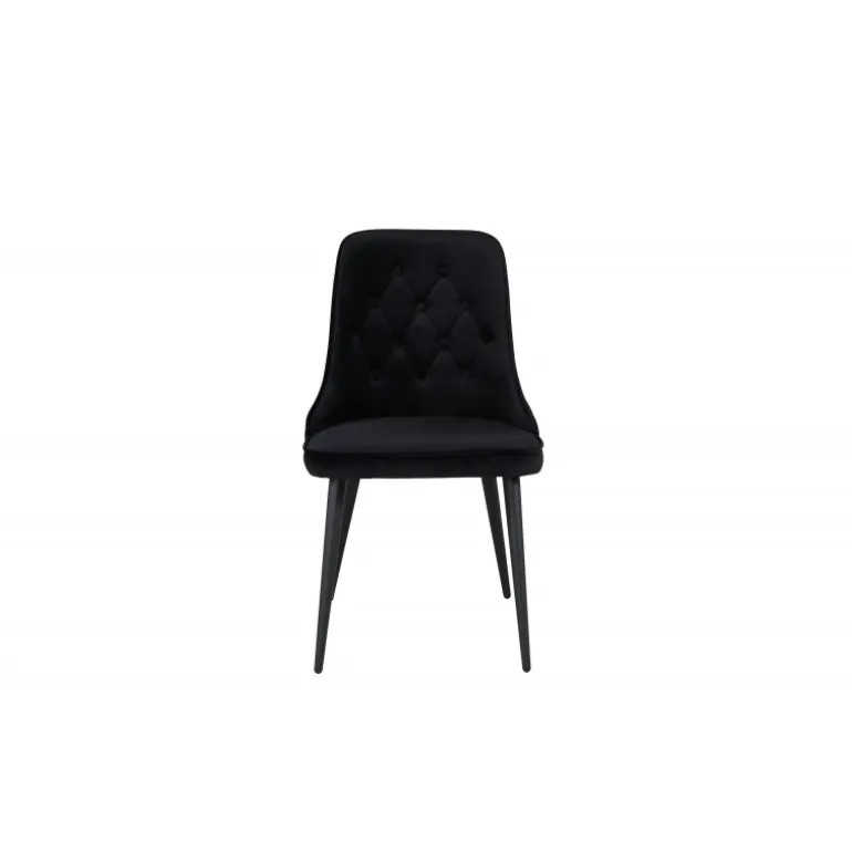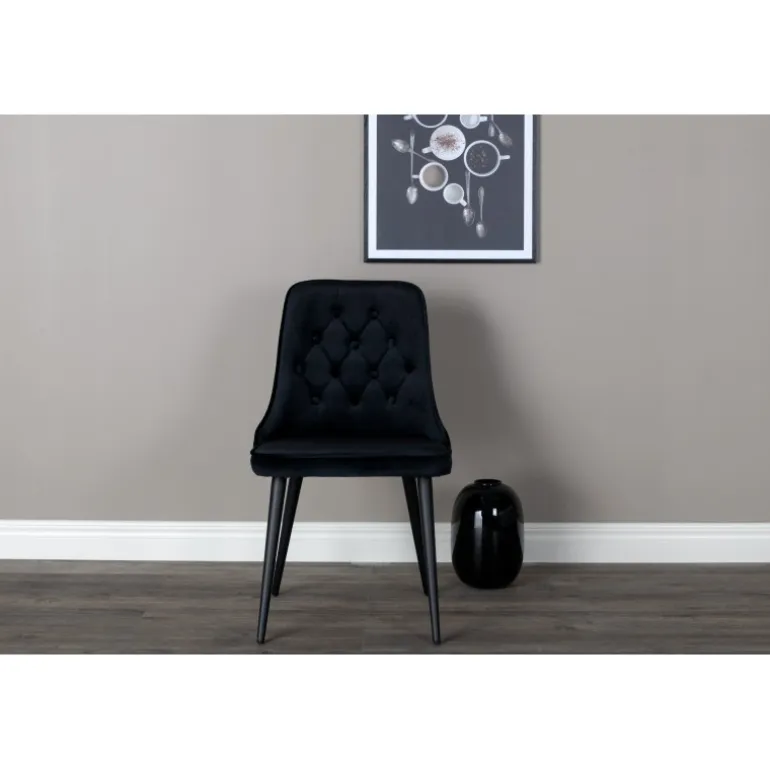 En fuldsort stol fra Velvet Deluxe-serien vil uden tvivl skabe et elegant blikfang i stuen! Stolen har et fuldt beklædt design i slankt sort velourstof med knapper og dekorative syninger i ryggen, som giver en flot detalje. Benene er lavet af sort pulverlakeret metal, og den bløde polstring i ryg og sæde sikrer ekstra komfort. Let montering kræves. Lad tiden her være dagens højdepunkt! Plejeråd: Velour har en tendens til at få trykmærker, når luven lægger sig ned. Trykmærkerne kan få stoffet til at se slidt ud, hvilket er helt normalt for denne type materiale. Afhængigt af, hvordan lyset falder, kan stoffet ændre sig i forskellige nuancer.
