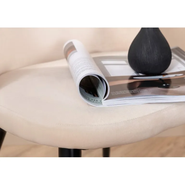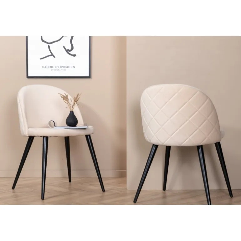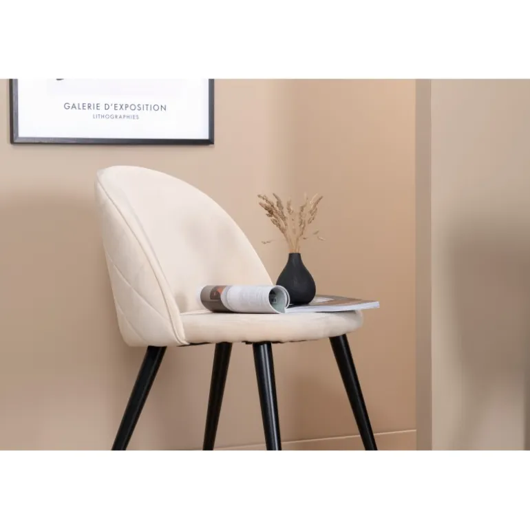 Detaljer skaber helheden! Velour spisebordsstolen imponerer med sit luksuriøse design og indbydende komfort. Ryggen er rundet, og ligesom sædet er den blødt polstret i beige Velour og polyesterstof med dekorative syninger og et diamantmønster på ryggen. Benene er let udadbuede i sort jern, hvilket giver et robust indtryk. Løft dit interiør til næste niveau og lad denne tid være dagens højdepunkt! Vedligeholdelsesråd: Velour har tendens til at få indtryk, når bunken lægger sig. Indtrykkene kan få stoffet til at se slidt ud, hvilket er helt normalt for denne type materiale. Afhængig af hvordan lyset falder, kan stoffet skifte i flere forskellige nuancer.