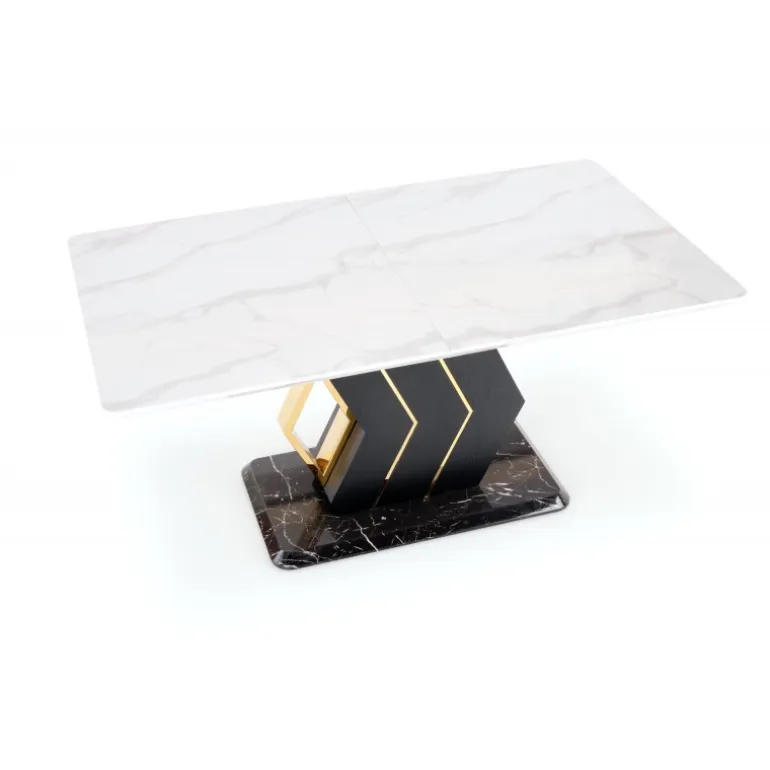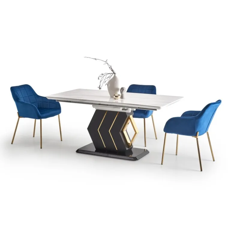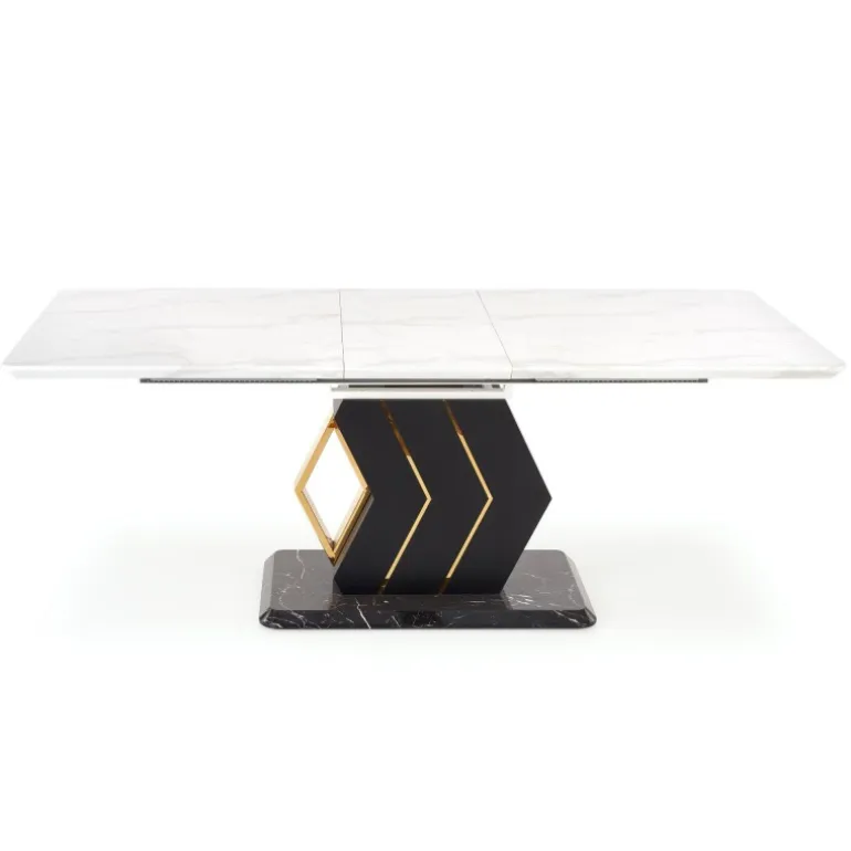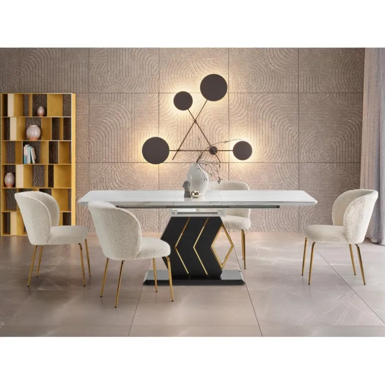 Oplev det elegante VINCENZO bord med hvid marmortop og Sort/guld ben, som bringer luksus til dit hjem. Dette Spisebord med udtræk er perfekt til både hverdag og festlige lejligheder. Med dimensionerne 160-200/90/77 cm er det både rummeligt og fleksibelt. Bordpladen er lavet af lamineret MDF, mens benene er i lakeret MDF og kromstål, hvilket giver en robust og holdbar konstruktion. VINCENZO bordet kombinerer stil og funktionalitet og er et must-have til enhver moderne bolig.