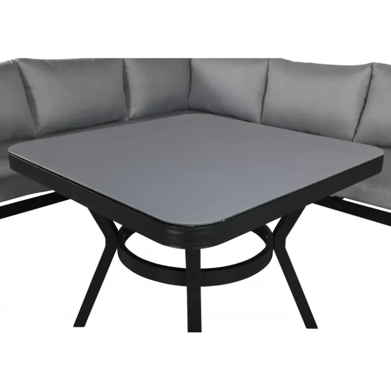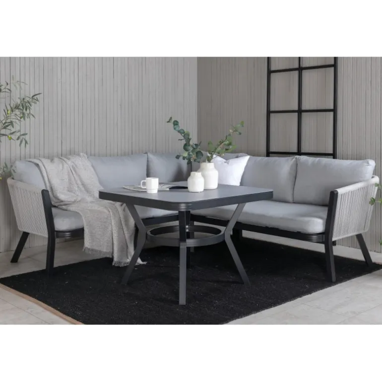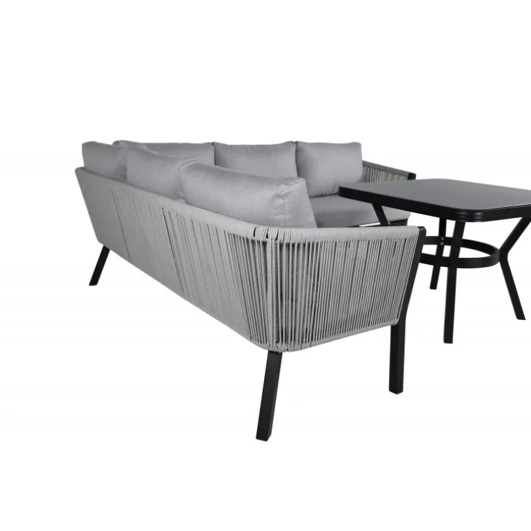 Virya er en moderne sofasæt, der fokuserer på komfort og design, og som garanteret vil blive en succes på terrassen denne sommer! Møbelgruppen består af en hjørnesofa lavet af et holdbart design i sort pulverlakeret metal med en ryg designet i lys grå reb samt et rektangulært højt sofabord med en bordplade i grå finish, der matcher rebene og skyggen af puderne og skaber en eksklusiv helhed. Bløde, lysegrå puder er inkluderet til sofasættet! Vedligeholdelsesråd: Vores reb er kvalitetsspunnet polyesterreb, der er let at rengøre. Møblerne er behandlet til at modstå 500-2000 timers sollys. Vi anbefaler sæbe og vand til rengøring. Lad det lufttørre. Til de områder, der er sværere at nå, kan en lille børste bruges forsigtigt. Brug aldrig højtryksrenser eller stærke kemikalier til at rengøre rebet.