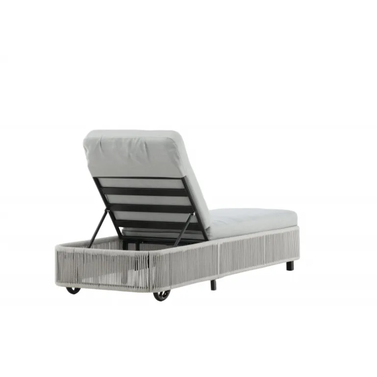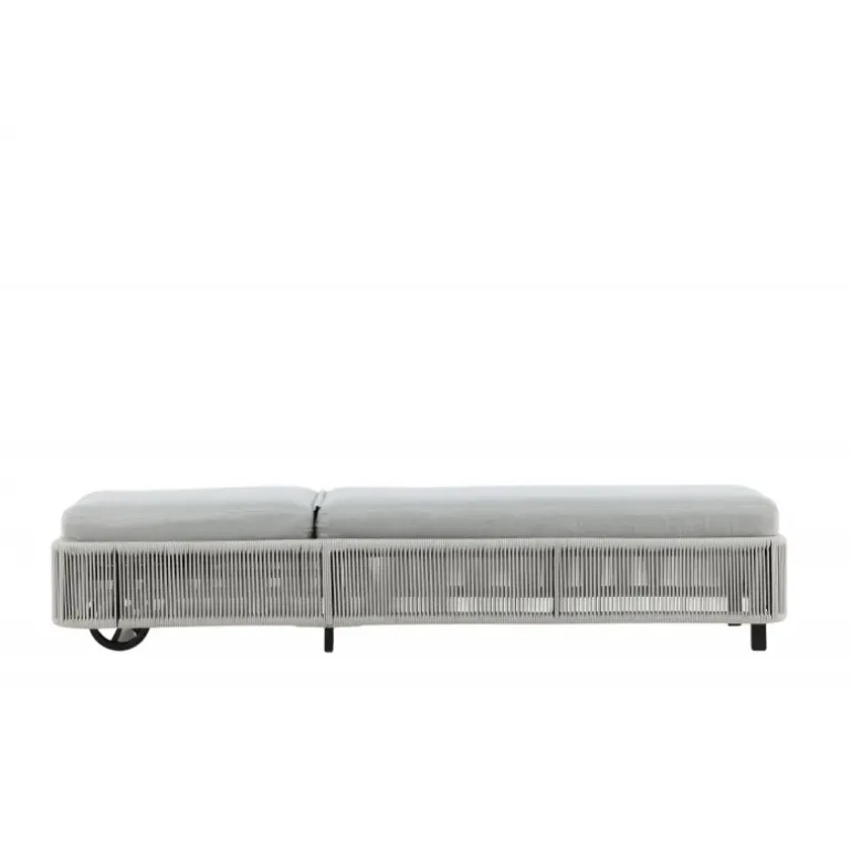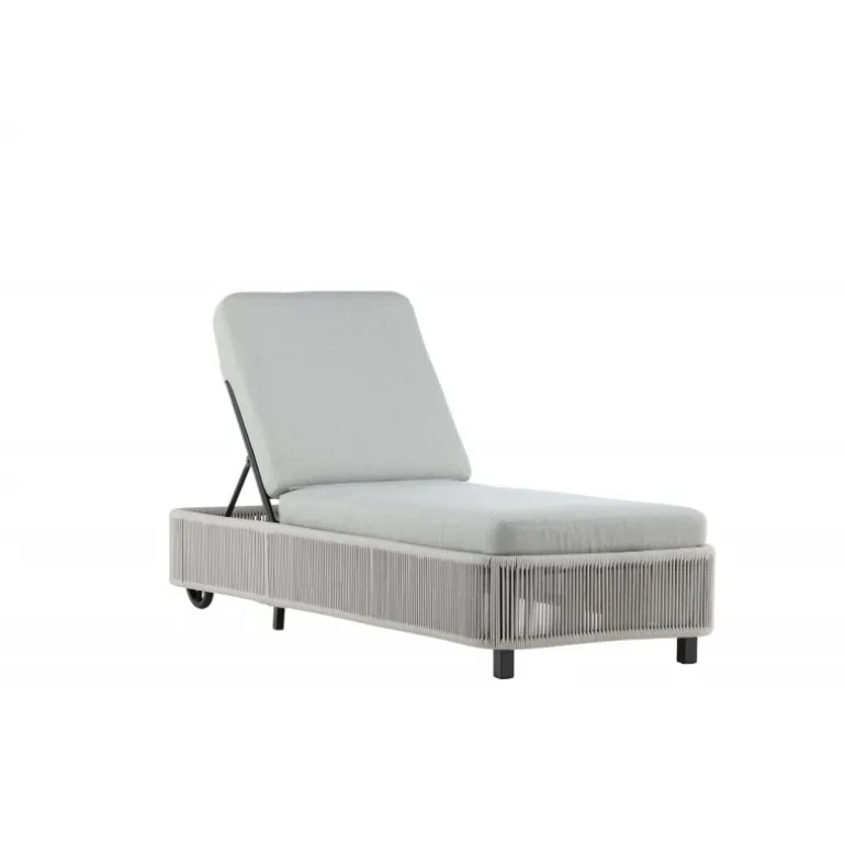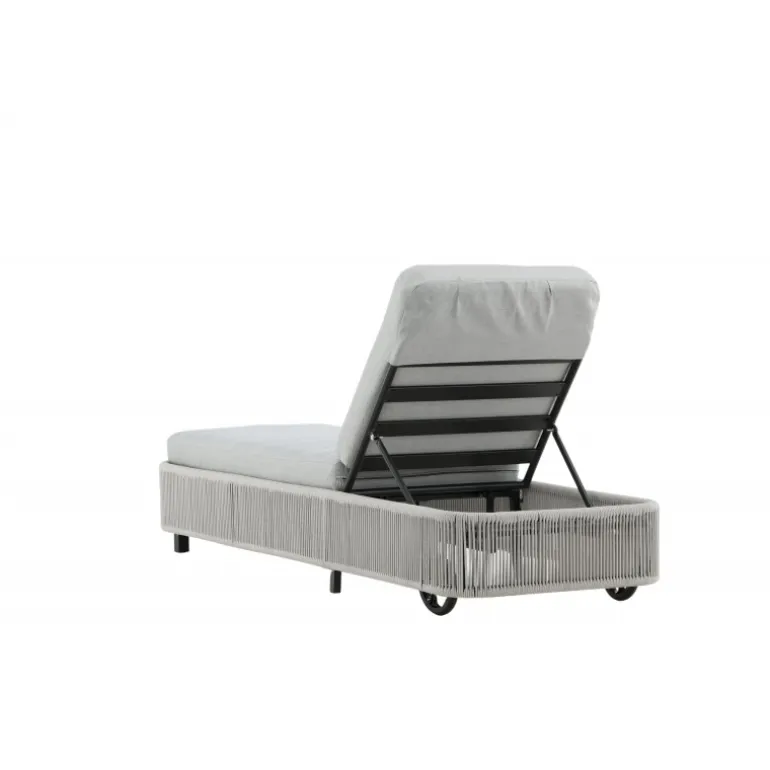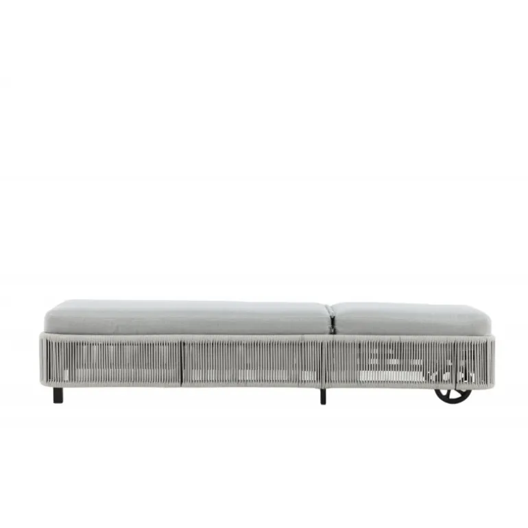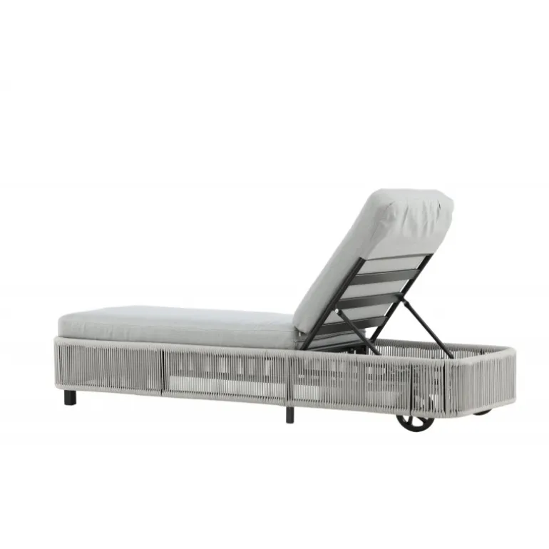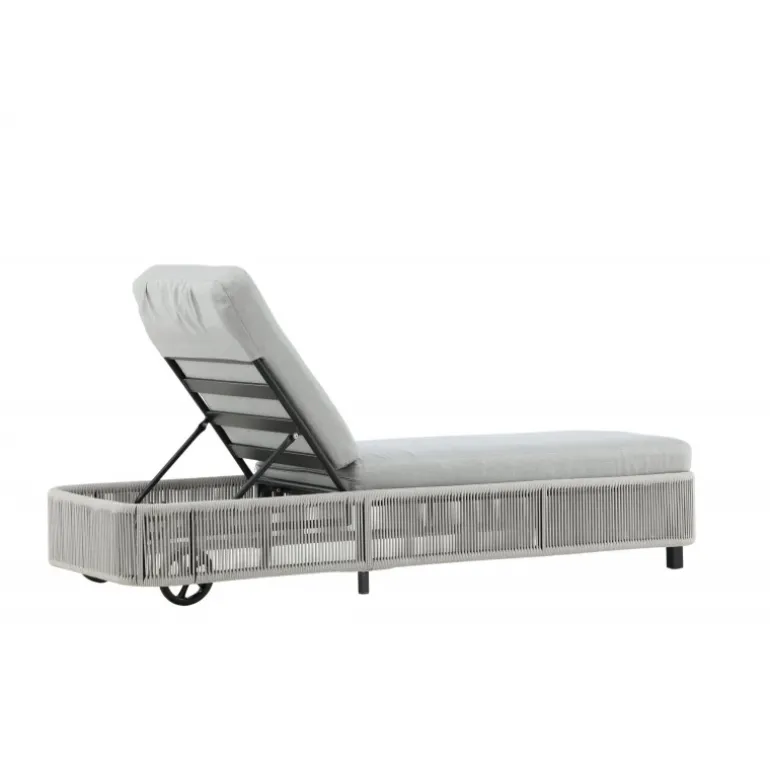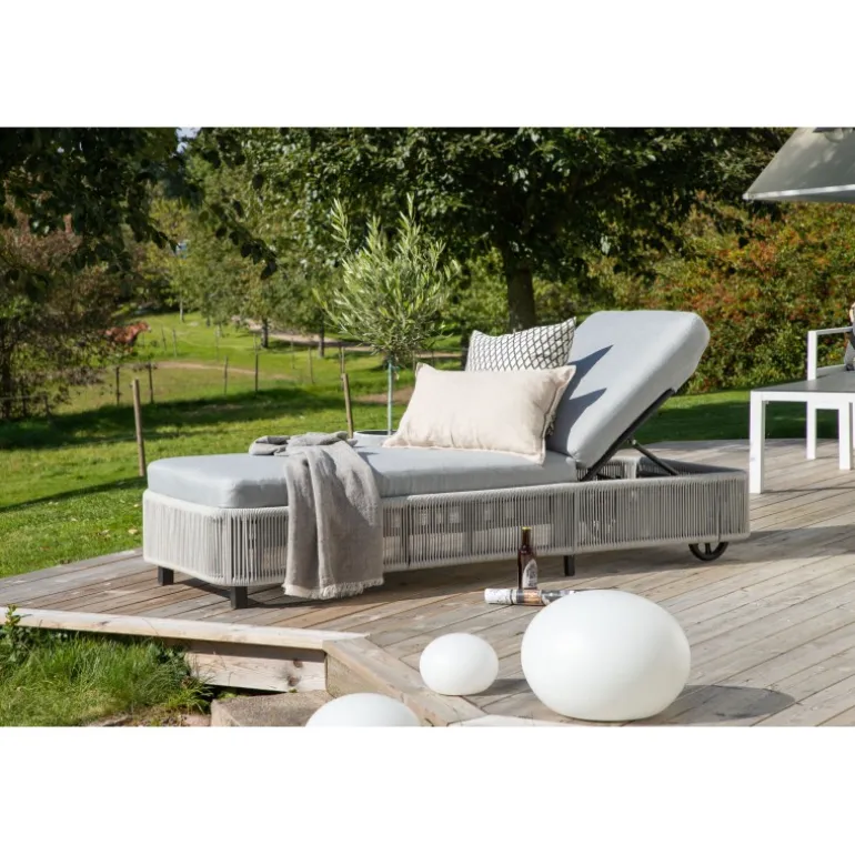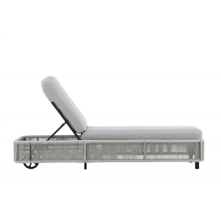 En klassisk solseng fremstillet af grå reb med tilhørende hynder. Placer den præcis hvor du vil, og flyt den nemt ved hjælp af hjulet. Nyd en varm sommerdag i solen på denne komfortable solseng. Fremstillet af holdbart aluminium, der ikke ruster, og leveres med hynder for ekstra komfort.