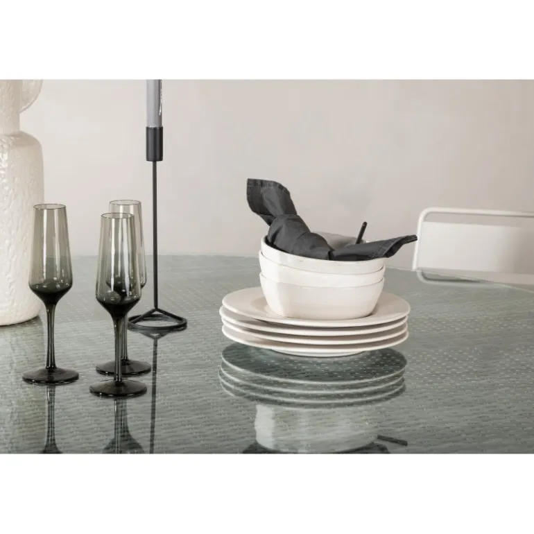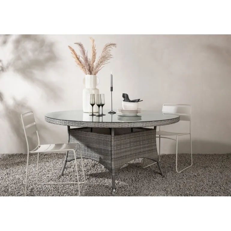 Volta er et rundt spisebord i robust design, der skaber et holdbart og charmerende indtryk! Bordpladen er i stilfuldt glas og understellet i holdbar, grå kunstig rattan. Indret udendørsområdet eller terrassen og lad middage under åben himmel blive dagens højdepunkt – her ender ingen på kanten! Kunstflet er et plastmateriale, der er perfekt til vores skandinaviske klima. Materialet er UV-resistent og kan modstå vejr og vind. At det er UV-resistent betyder, at møblerne ikke falmer, men vi anbefaler altid at opbevare møblerne under et møbelbetræk eller et andet tørt og køligt sted for at forlænge levetiden.