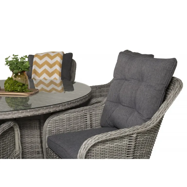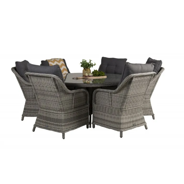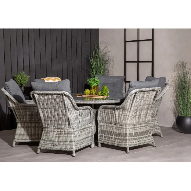 Oplev en fantastisk familie- og sammenholdsfølelse med det Volta Rundt Loungesæt – Havemøbelsæt! Dette sæt består af det elegante Volta spisebord og de robuste Vikelund kunststoftarmsstole, hvilket giver dig et imponerende Loungesæt – Havemøbelsæt, der holder i mange år. Spisebordet har en grå glasbordplade, mens stolene er lavet af bestandigt flet, som er UV-resistent og kan modstå vejr og vind. Inkluderede hynder gør sættet endnu mere komfortabelt og indbydende.