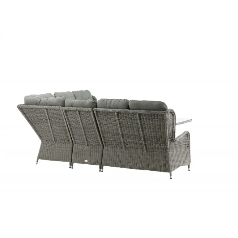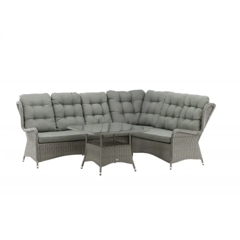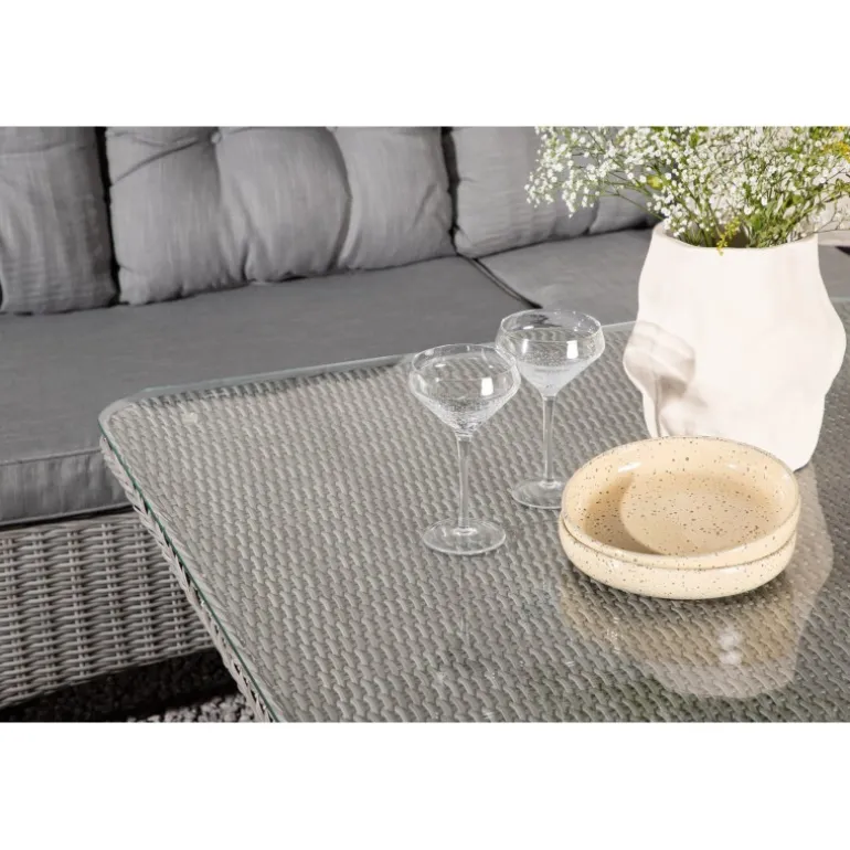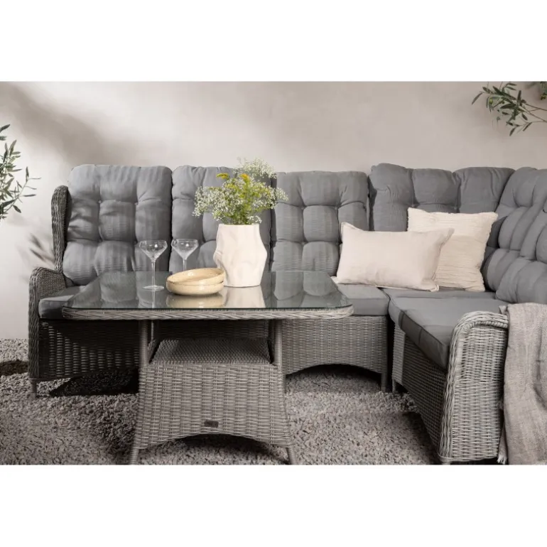 Washington er et eksklusivt loungesæt med en kombination af tidløst design og fantastisk komfort – det vil uden tvivl blive en succes på din terrasse denne sommer. Sofagruppen består af en hjørnesofa med 6 siddepladser og en hjørnedel samt et højere sofabord med en praktisk hylde og en glasbordplade. Fremstillet af lysegrå kunstig rattan med aluminiumsramme. Bløde, tykke, lysegrå hynder medfølger til sofagruppen. Nyd sene sommeraftener på den bedste måde! Plejevejledning: Konstrite er et plastmateriale, der er perfekt til vores skandinaviske klima. Materialet er UV-resistent og kan modstå vejr og vind. At det er UV-resistent betyder, at møblerne ikke falmer, men vi anbefaler altid at opbevare møblerne under en møbelbeskyttelse eller på anden måde tørt og køligt for at forlænge levetiden.