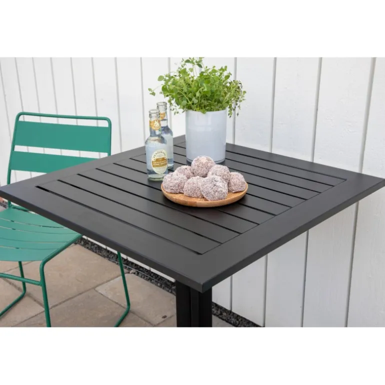 Way Cafébord – et stilfuldt cafébord i tidløst sort design. Fremstillet af sort aluminium, hvilket gør bordet både praktisk og holdbart. Den lette vægt gør bordet nemt at flytte og passer lige så godt i haven som på den lille altan. Nyd sommerens vidunderlige øjeblikke! Plejeanvisning: Havemøbler i aluminium og rustfrit stål bør rengøres regelmæssigt med vand og mild sæbe. Skyl altid grundigt med rigeligt vand, hvilket bliver ekstra vigtigt, hvis møblerne er placeret nær havet, hvor salt kan transporteres gennem luften.