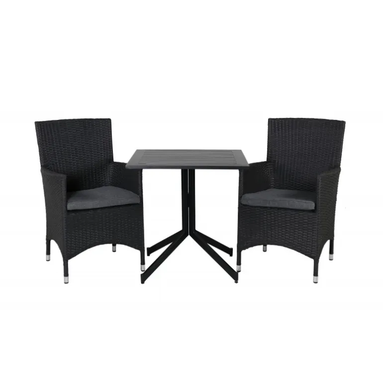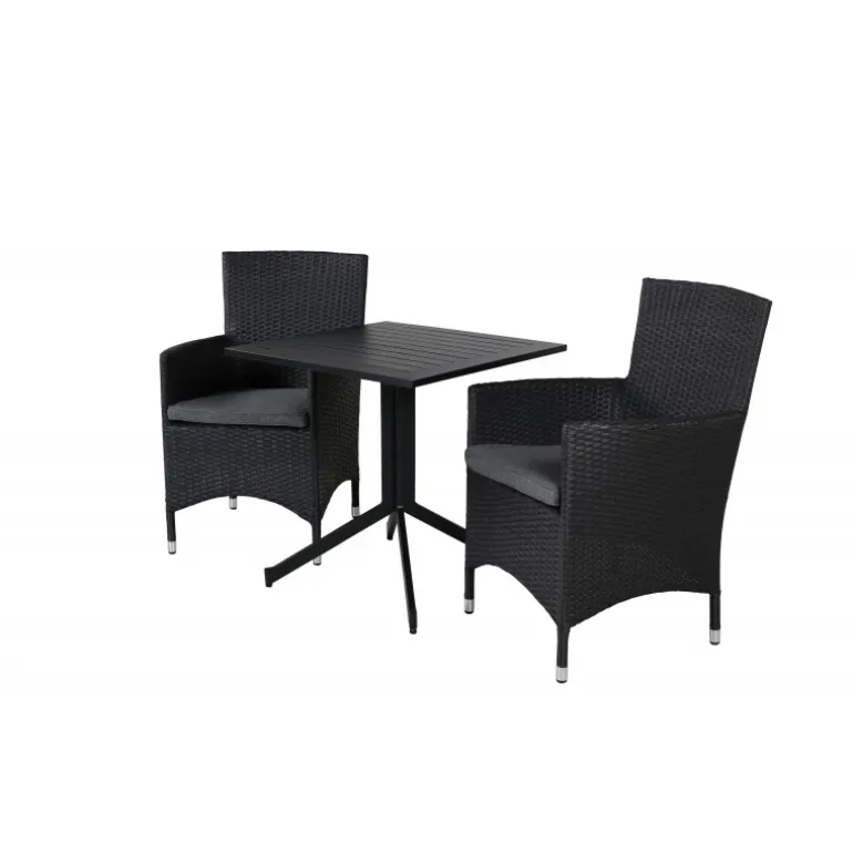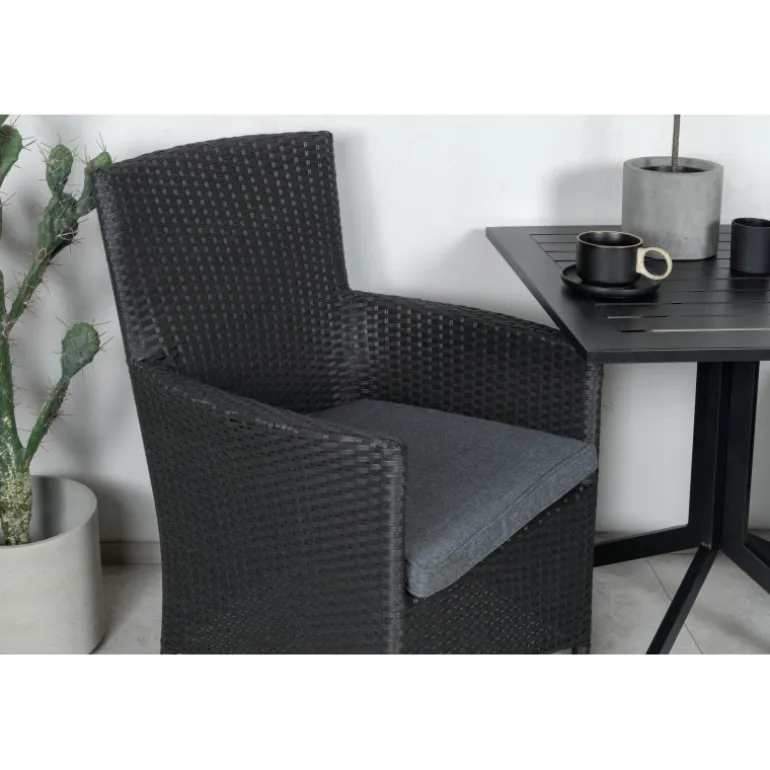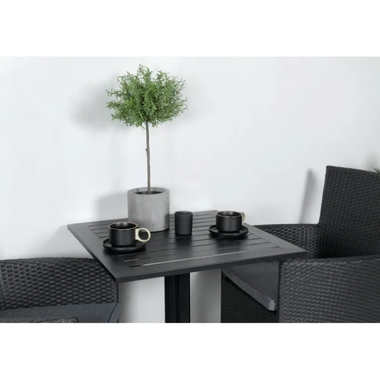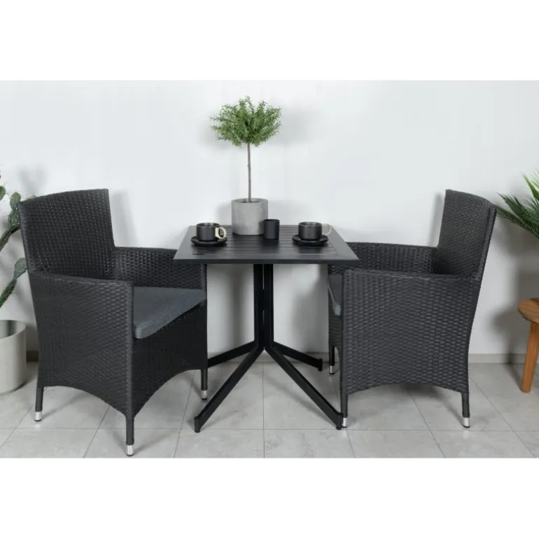 Slap af denne sommer rundt om et luksuriøst cafébord i solen! Den klassiske stil spisestuebord kombineres med komfortable spisebordsstole fra Malin-serien. Nyd en kop kaffe eller et køligt glas juice på din terrasse med denne trendy madgruppe i stilfuld sort farve. Holdbar og vejrbestandig, dette sæt er perfekt til udendørs brug og vil tilføje et strejf af elegance til din have.