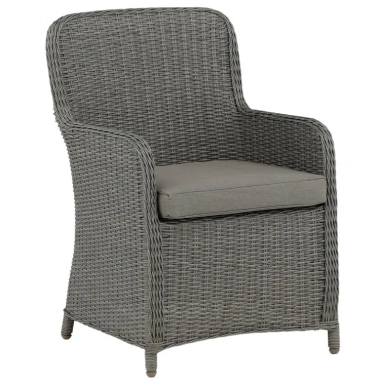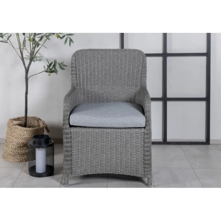 Skab en afslappende blikfang på terrassen denne sommer med denne spisestol fra Wembley-serien. Det stilfulde design og den lækre grå farve giver et moderne indtryk. Stolen er en ægte klassiker og passer ind i de fleste husholdninger. Med høje armlæn bliver stolen komfortabel at sidde i tæt på bordet. Sid behageligt og nyd dejlige måltider udendørs! Rådgivning om pleje: Konstrite er et plastmateriale, der er perfekt til vores skandinaviske klima. Materialet er UV-bestandigt og kan modstå vejr og vind. Det faktum, at det er UV-bestandigt, betyder, at møblerne ikke falmer, men vi anbefaler altid at opbevare møblerne under en møbelbeskyttelse eller ellers tørt og køligt for at forlænge levetiden.
