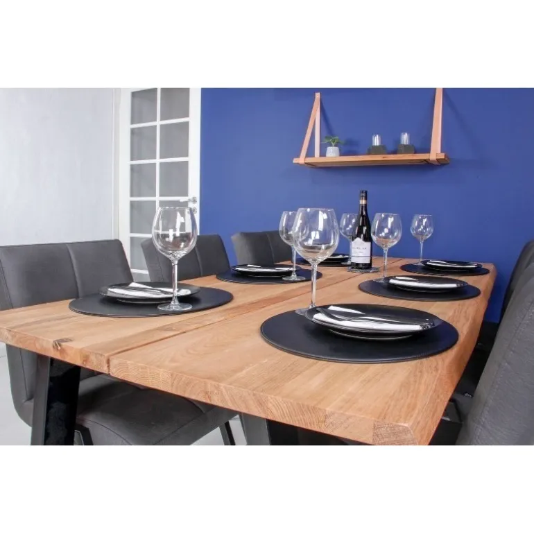 Er du til det rustikke trælook, og vil du ikke gå på kompromis med kvaliteten, så er dette yderst indbydende plankespisebord det ideelle valg. Bordpladen er udført i massive olierede egetræsplanker med naturligt bølgede, skrå kanter, som giver bordet et varmt og charmerende udtryk. Det robuste sortlakerede metalstel sikrer, at bordet har en yderst stabil og robust konstruktion, ligesom de komplementerer egetræsplankerne på bedste vis. Et langtidsholdbart kvalitetsdesign, der emmer af patina.