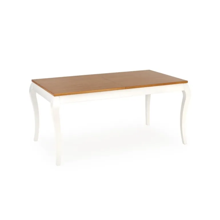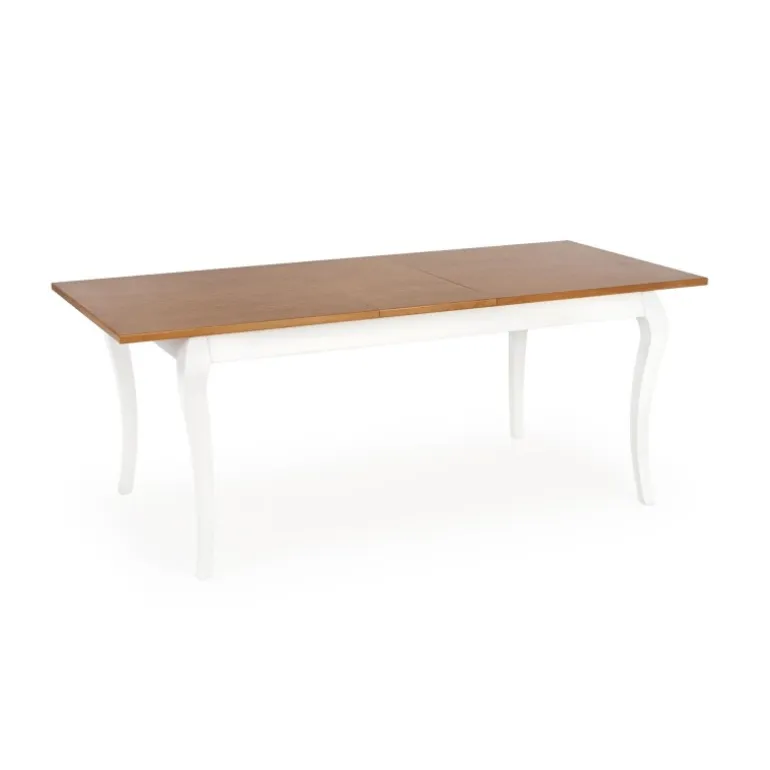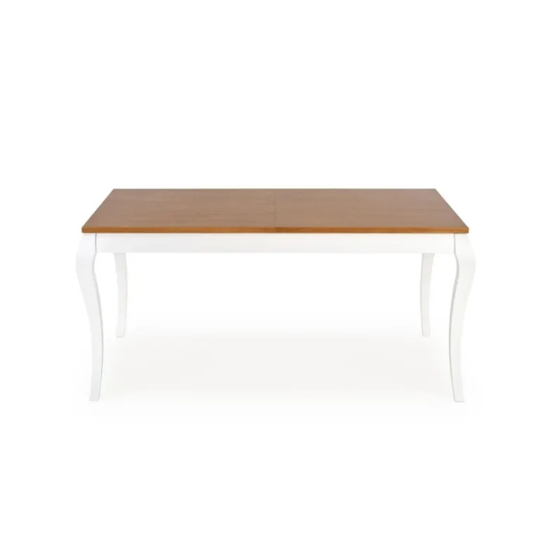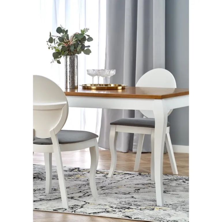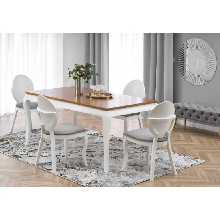 WINDSOR Spisebord med udtræk er den perfekte løsning til både små og store sammenkomster. Med sine fleksible mål på 160-240/90/76 cm kan bordet nemt tilpasses dine behov. Bordpladen er lavet af en kombination af møbelplade og naturlig egefiner, hvilket giver et elegant og holdbart udseende. Benene er fremstillet af massivt bøgetræ og er malet i en stilfuld hvid farve, der komplimenterer den mørke egfarve på toppen. Dette bord er både praktisk og æstetisk, hvilket gør det til et ideelt valg for enhver spisestue.