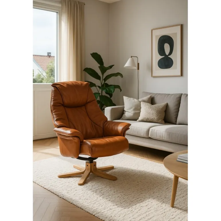 Drejestol med dejlig komfort. Ryggen kan lænes tilbage, så man opnår forskellige siddepositioner til gavn for ryggen og bekvemmeligheden.