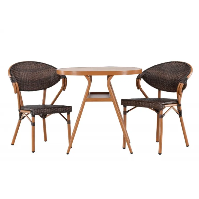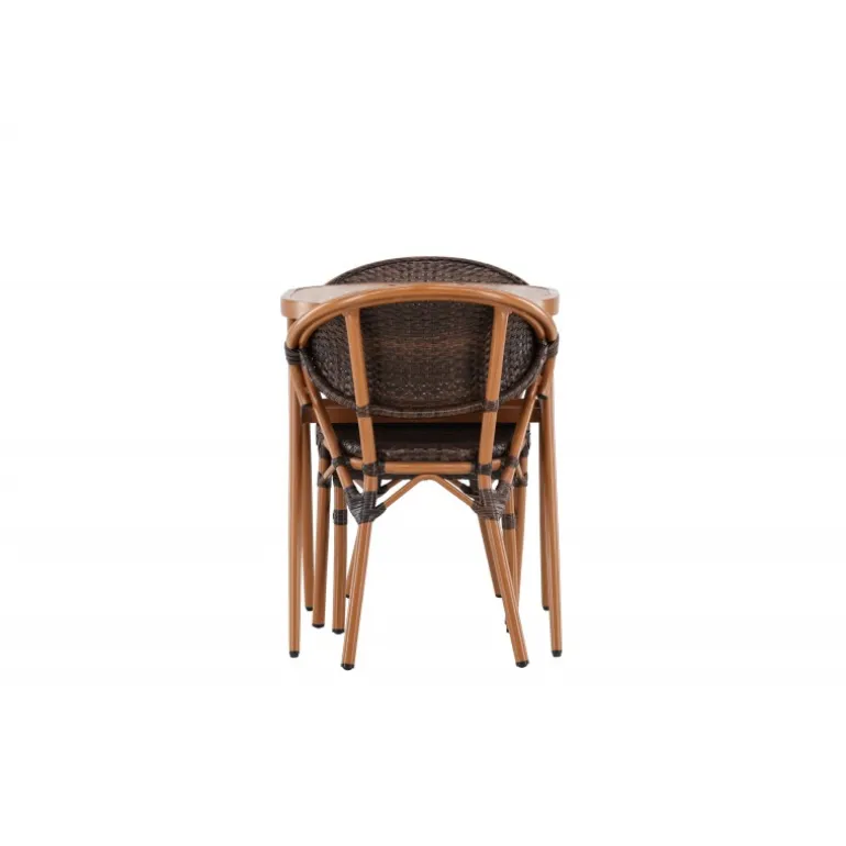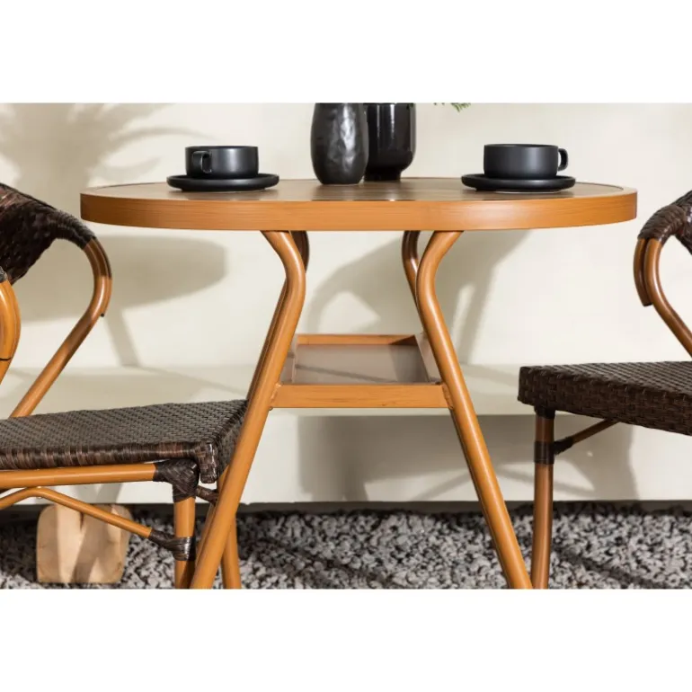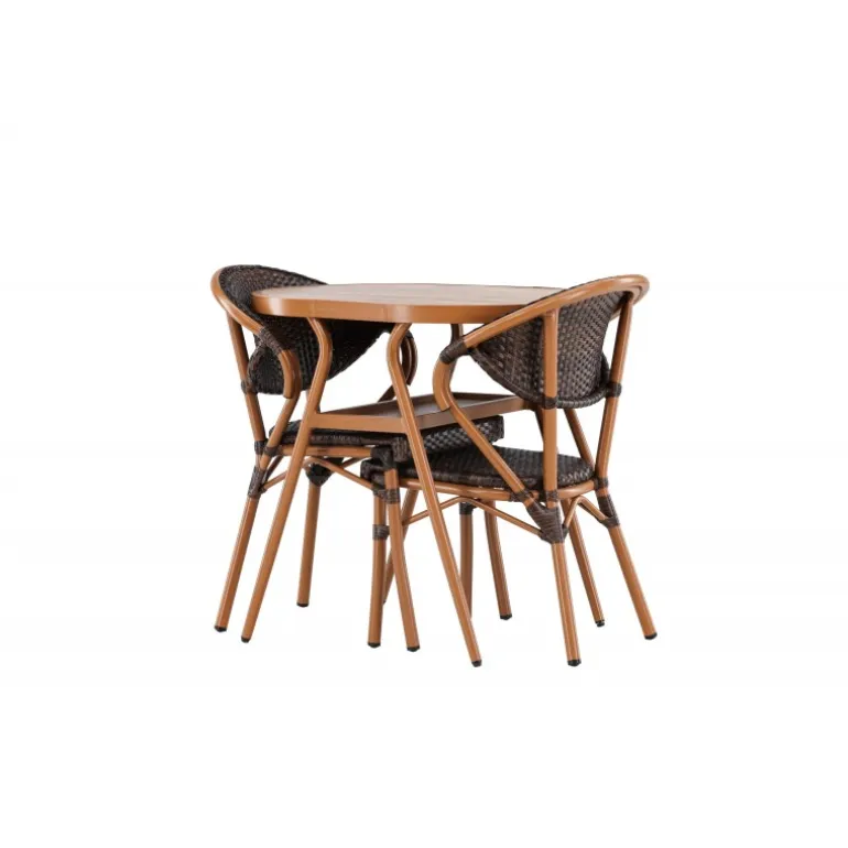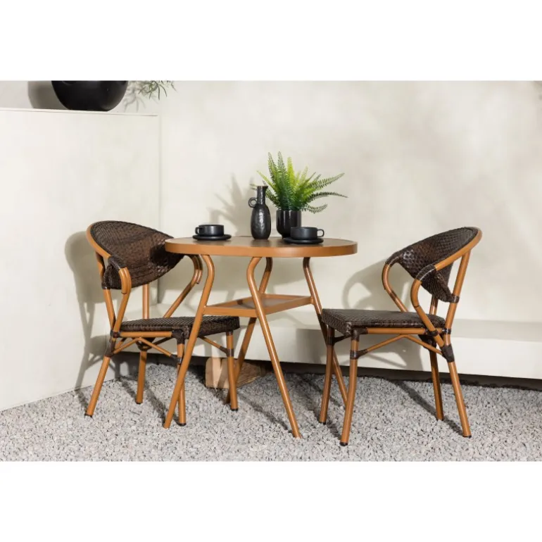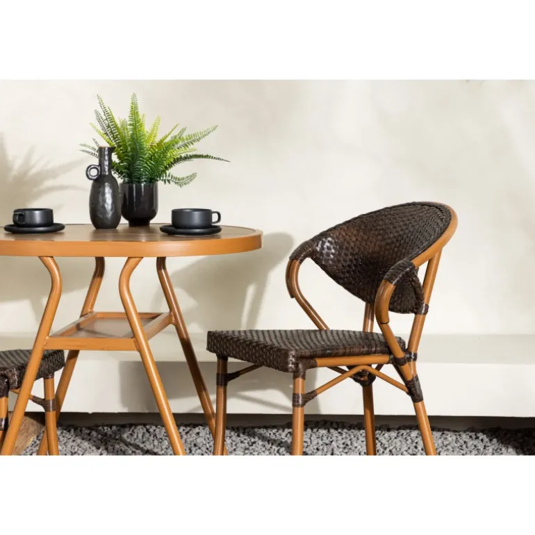 Forvandl dit udendørs område til et indbydende og komfortabelt rum med vores elegante Abrantes sæt, bestående af to stole og et bord. Dette sæt i en varm brun nuance har et alsidigt design, der passer ind i forskellige interiørstile. Abrantes gruppen er nem at flytte og vedligeholde, hvilket gør det til en praktisk og bekvem løsning til udendørs afslapning. Det funktionelle bord har en ekstra overflade under bordpladen. Med Abrantes sættet kan du skabe et harmonisk og indbydende udendørs miljø, hvor du kan slappe af og socialisere med stil. Lad Abrantes forbedre dine udendørs øjeblikke og skabe et sted, hvor komfort og skønhed mødes.