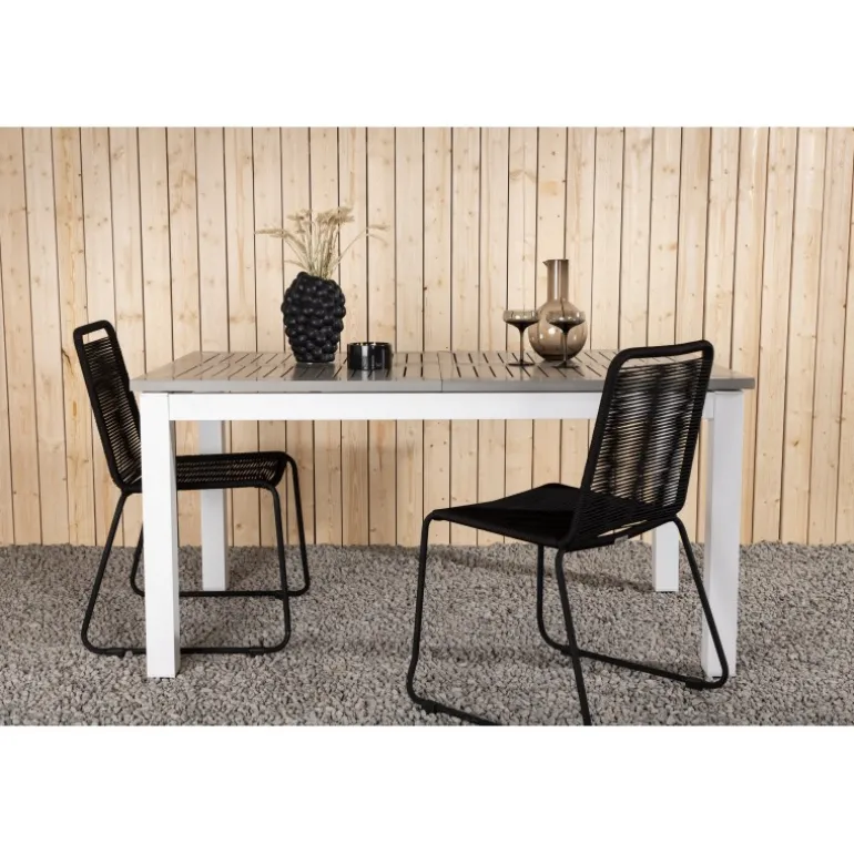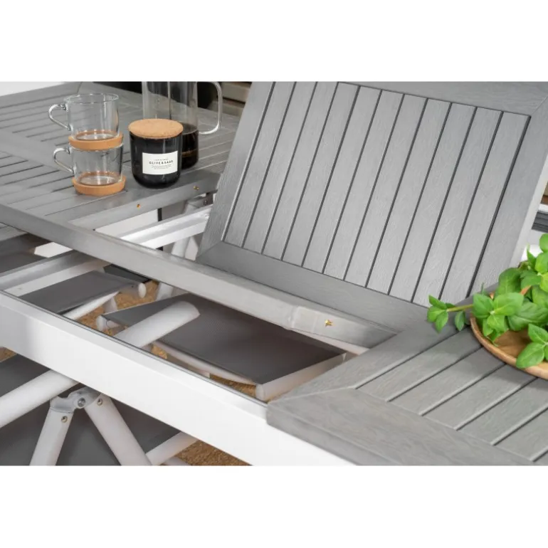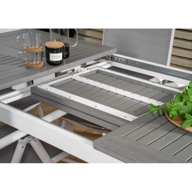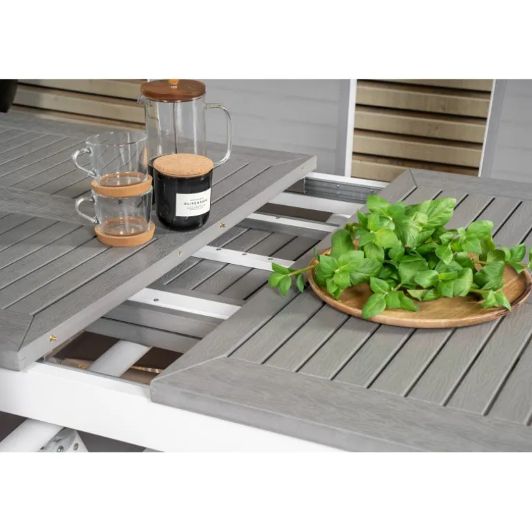 Albany er et udtrækkeligt spisebord med alt det rigtige – stilfuldt, praktisk og tidløst! Bordpladen er i grå Aintwood og kroppen i hvid aluminium; to holdbare materialer, der giver dig et bord, som holder over tid. Den rette nordiske form giver et robust og rent indtryk. Møbler terrassen og skab et charmerende centrum at samle dine kære omkring! Plejeanvisning: Materialet er designet til udendørs brug, da det er vejrbestandigt og modstår både fugt og skimmel. Aintwood er derfor et optimalt materiale til udendørsmøbler. Undgå skader på bordet ved at bruge underlag og ikke placere varme genstande direkte på overfladen.