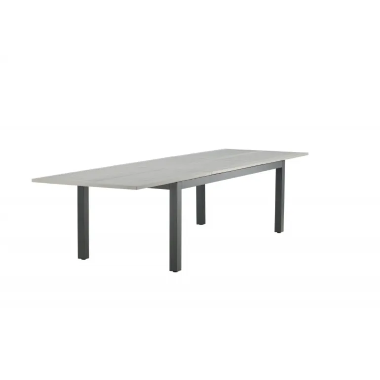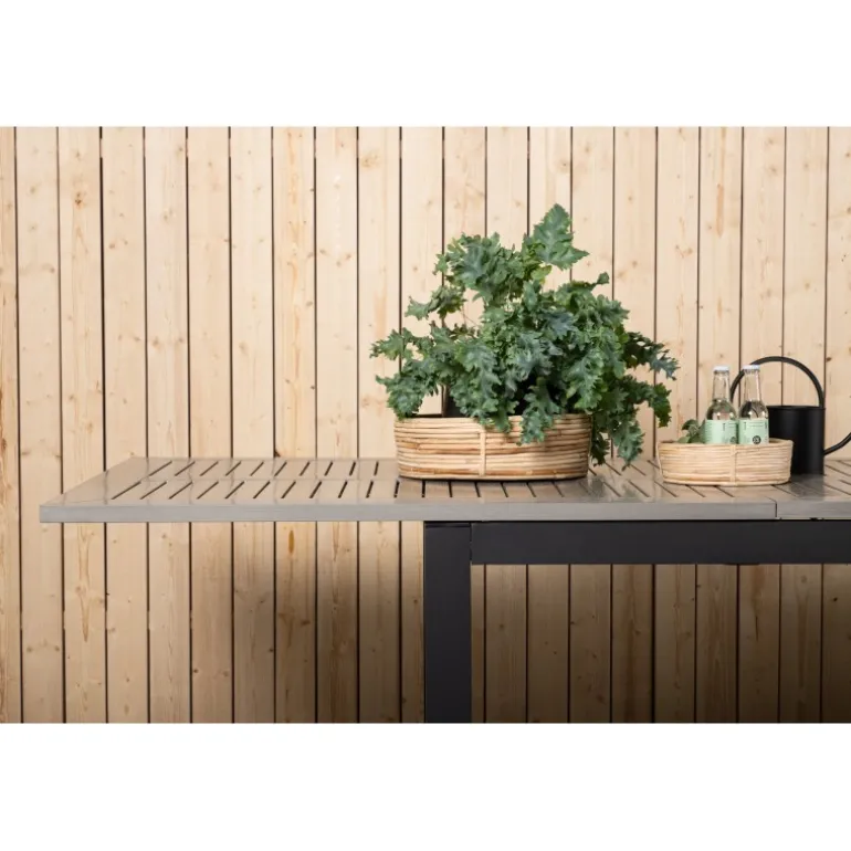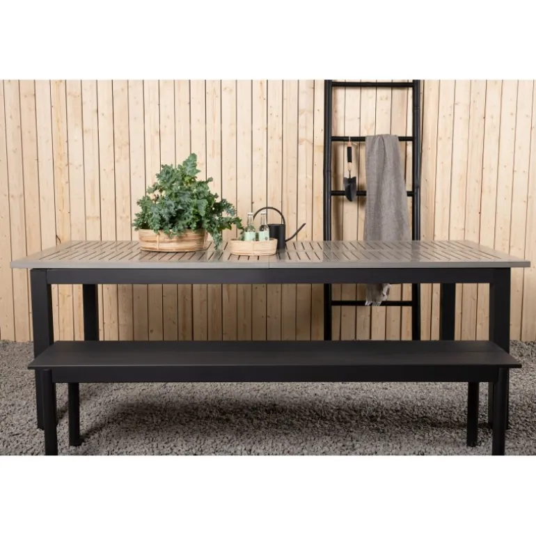 Albany er et udtrækkeligt spisebord, der har alt det rigtige – stilfuldt, praktisk og tidløst! Bordpladen er lavet af grå Aintwood, og stellet er af sort aluminium; to holdbare materialer, der giver dig et bord, der holder over tid. Den enkle nordiske form giver et robust og rent indtryk. Indret terrassen og skab et charmerende samlingspunkt for dine kære! Plejeråd: Materialet er designet til at blive brugt udendørs, da det er vejrbestandigt og modstår både fugt og skimmel. Aintwood er derfor et optimalt materiale til udendørsmøbler. Undgå skader på bordet ved at bruge underlag og ikke placere varme genstande direkte på overfladen.