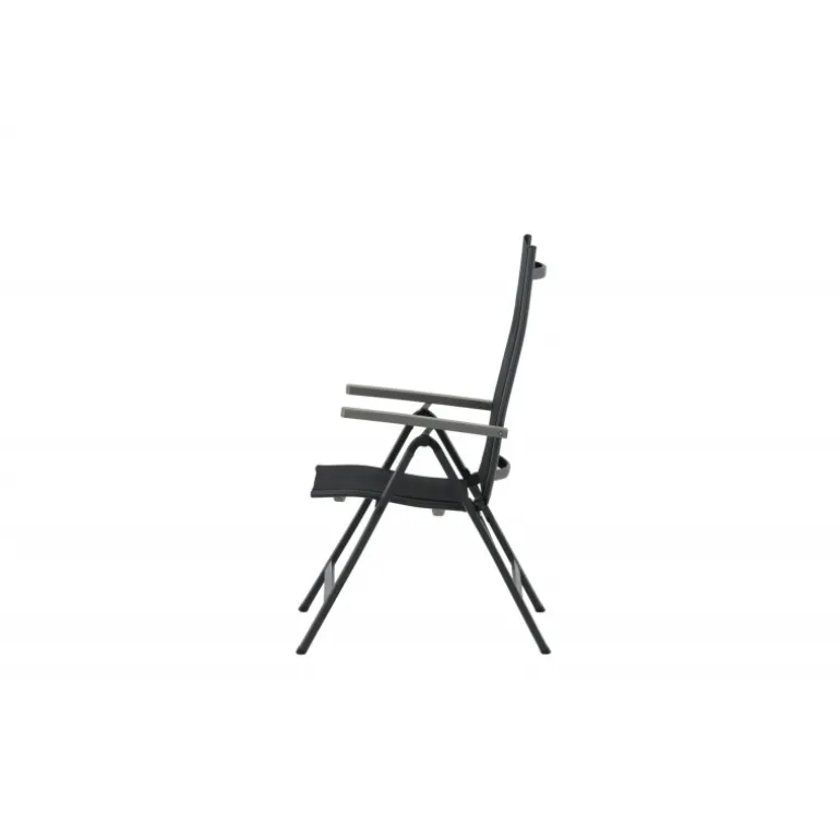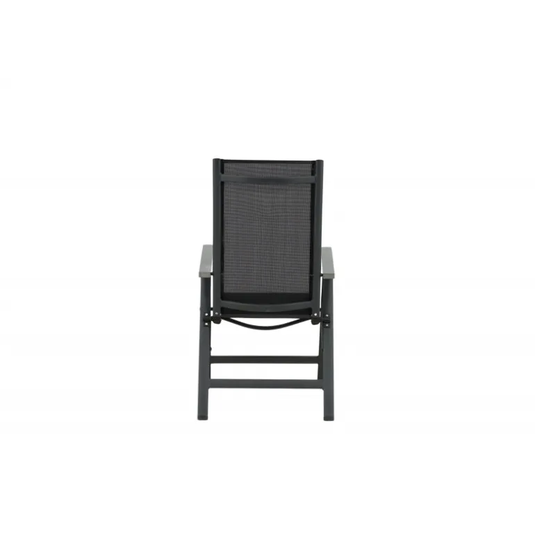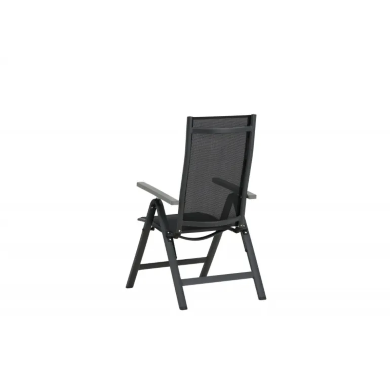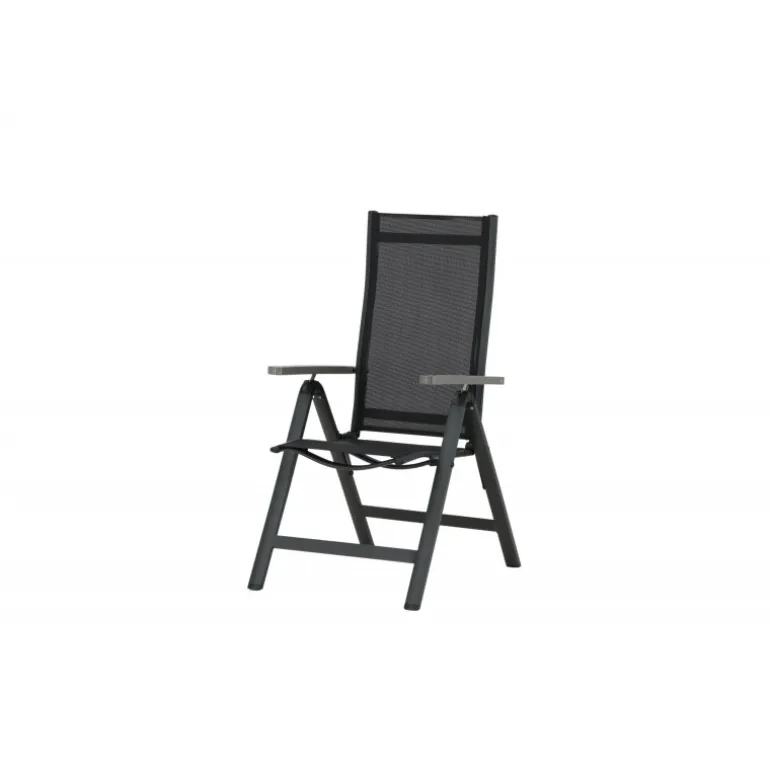 Albany, vores praktiske 5-positionsstol i sort farve med armlæn for ekstra komfort. Stolen gør sig lige godt i haven som på balkonen. Nyd sommeren på den bedste måde! Plejeanvisning: Textilene er et syntetisk stof lavet af PVC-behandlet polyester. Materialet er vandafvisende og UV-behandlet for at modvirke solens blegning. Rengøring bør ske cirka en gang om måneden; brug en fugtig klud og tør efter.