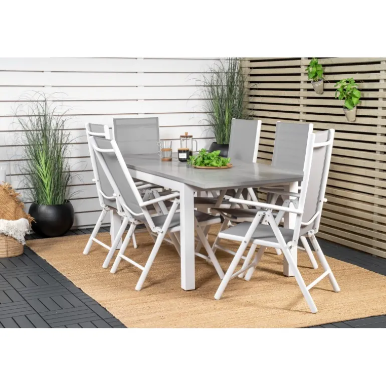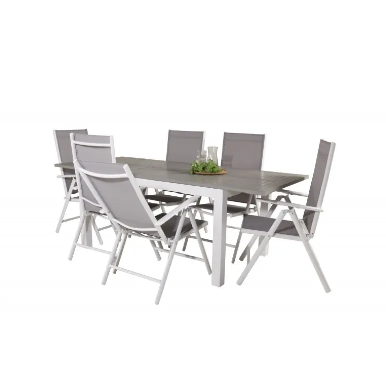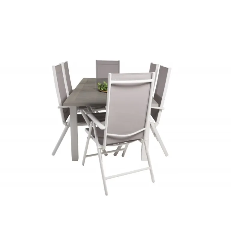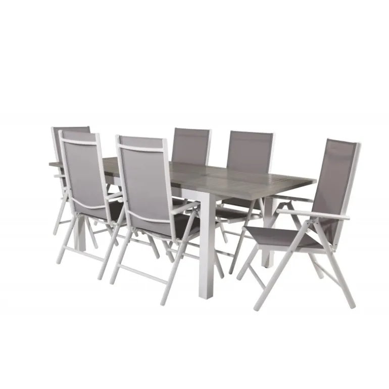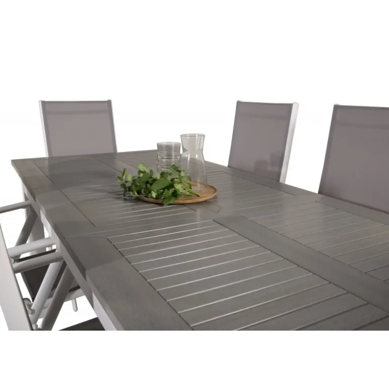 Materialer: Aintwood, Aluminium og Textilene gør sættet både stilfuldt og holdbart. Farver: Grå og Hvid, der passer perfekt til enhver udendørs indretning. Vedligeholdelse: Aintwood er følsomt overfor høje temperaturer, så det er vigtigt at undgå at placere møblerne i uventilerede eller glasinddækkede områder. Rengør dagligt med en fugtig klud og sæbevand.