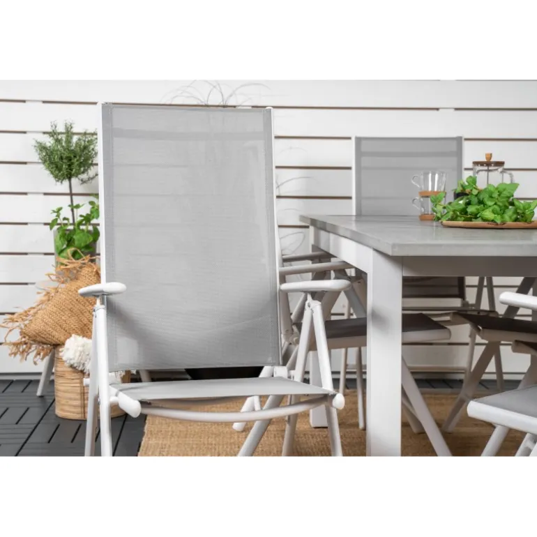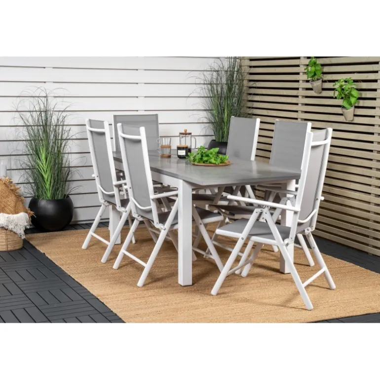 Her præsenterer vi et madgruppe med et moderne og indbydende udtryk, der garanteret vil pynte på din terrasse! Vores lækre spisebord Albany er her kombineret med foldbare spisebordsstole i Break-serien. Forlæng den solrige frokost i en komfortabel madgruppe!