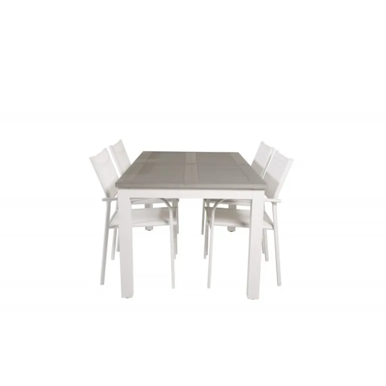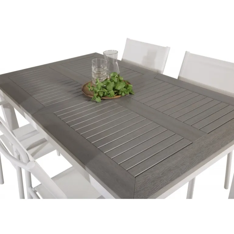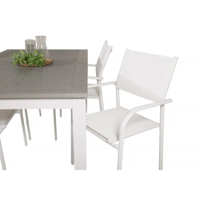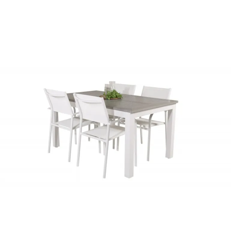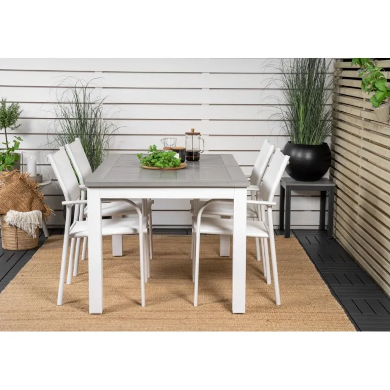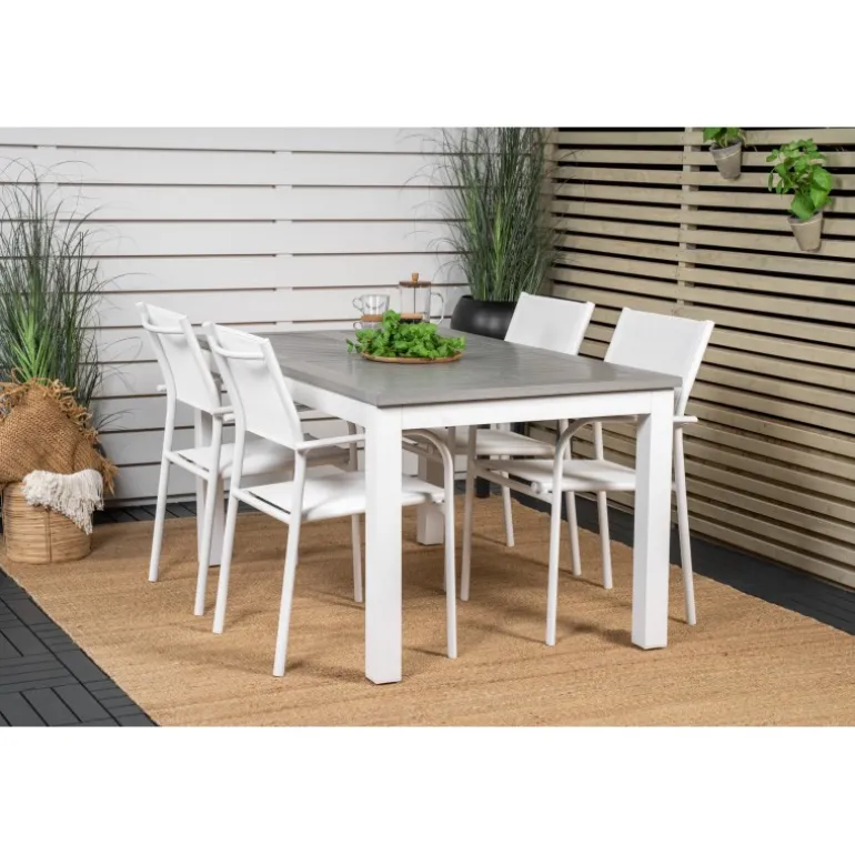Vores udtrækkelige spisebord Albany i et slankt design, sammen med spisestolene Santorini – den perfekte kombination for dem, der ønsker et trendy Loungesæt – Havemøbelsæt på terrassen. Stolene har en høj siddekomfort, som indbyder til lange og dejlige stunder til socialt samvær!
