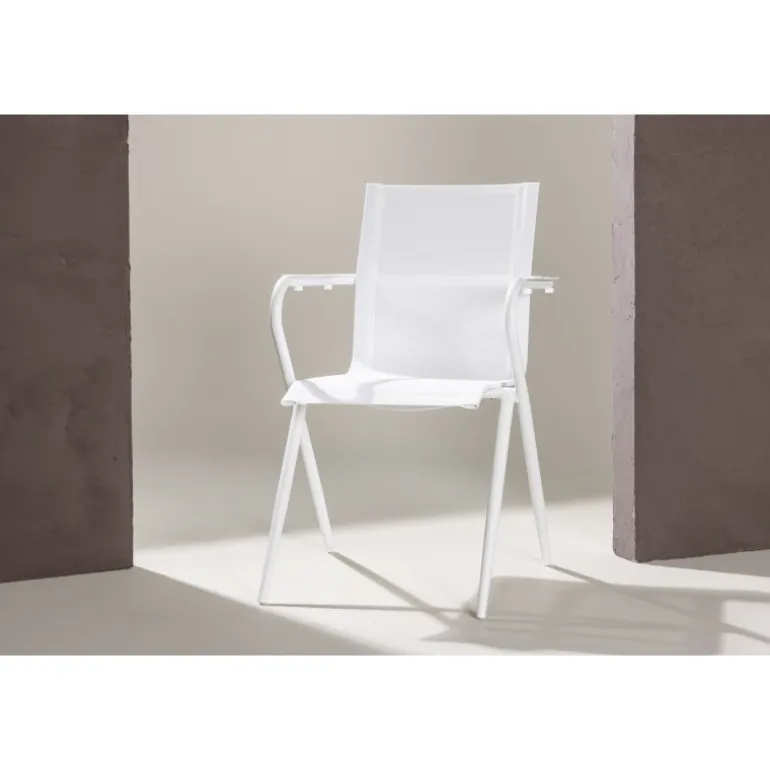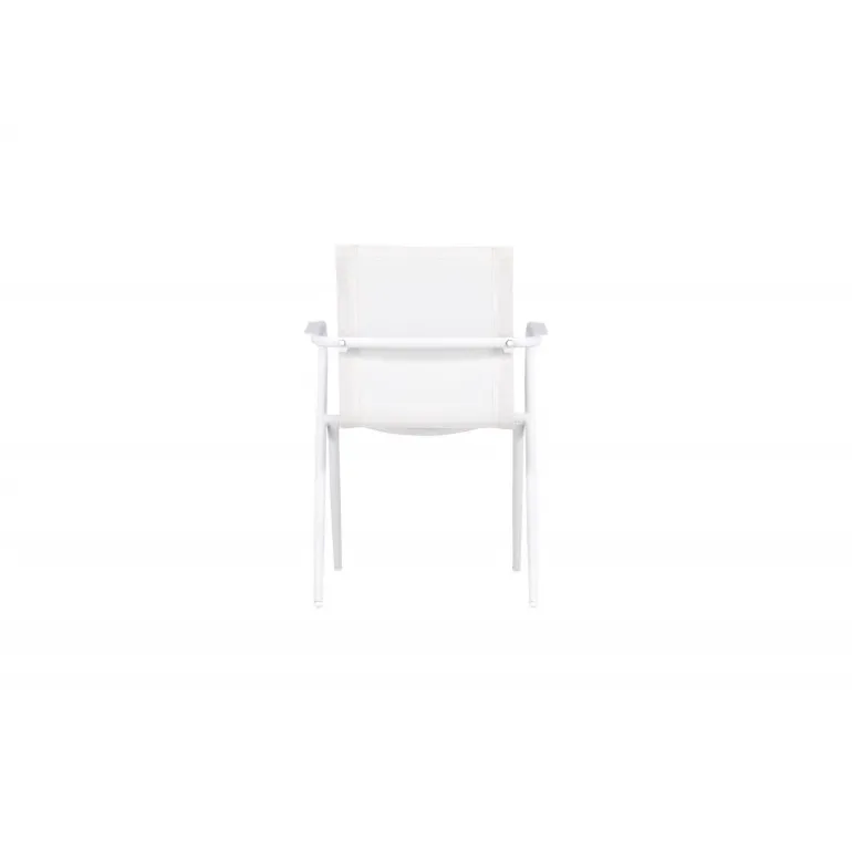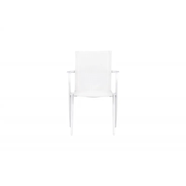 Alina er en hvid smagfuld Havestol perfekt til udendørsområder og terrasser. Med sin enkle design passer den ind i alle miljøer og stilarter. Det moderne design med skrå ben og armlæn gør den både stilfuld og praktisk. Nyd sommermåltiderne! Stolen kan stables for nem opbevaring. Plejeråd: Vores møbler i tekstil er ofte kombineret med teak eller aluminium. Textilene er et syntetisk stof lavet af PVC-behandlet polyester. Materialet er vandafvisende og UV-behandlet for at modvirke solens blegning.