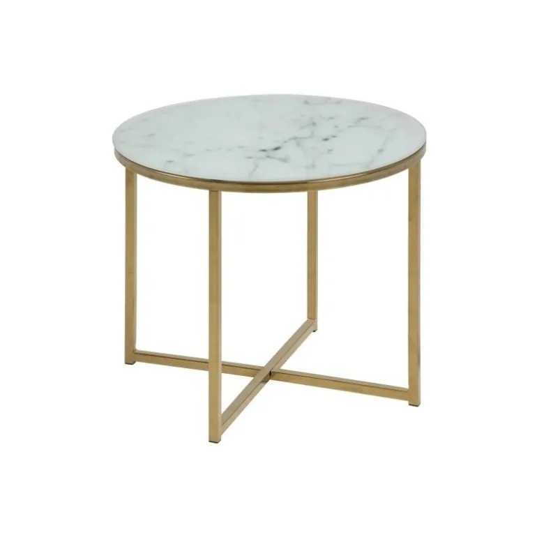 Lille rundt bord, med krystalklart hvid marmor print på bordpladen, og 6 mm stel i gylden krom. Designet er udformet i et flot antikt look, og passer godt sammen med de øvrige borde i serien Andalucia.