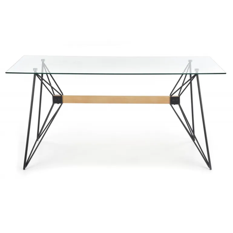 - Materiale: Top i transparent glas, ben i solid bøgetræ og pulverlakeret stål.