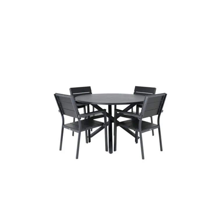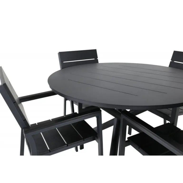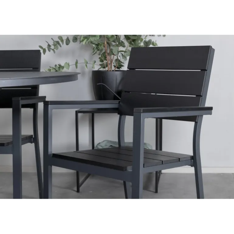 Delikate matchende Loungesæt – Havemøbelsætr til alle sommermåltider – passer lige så godt i udendørsområdet som på altanen! Levels er en praktisk stol i sort aluminium med sort sæde og ryg i Smaster Aintwood. Stolen er stabelbar, hvilket giver nem opbevaring. Her sammen med vores runde spisebord Alma i sort aluminium. Skab den perfekte sociale atmosfære på terrassen!