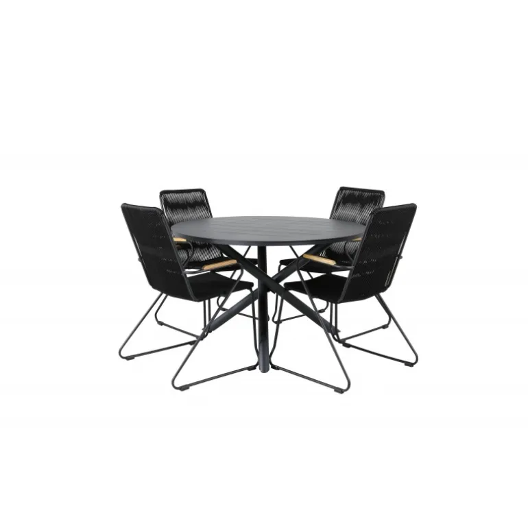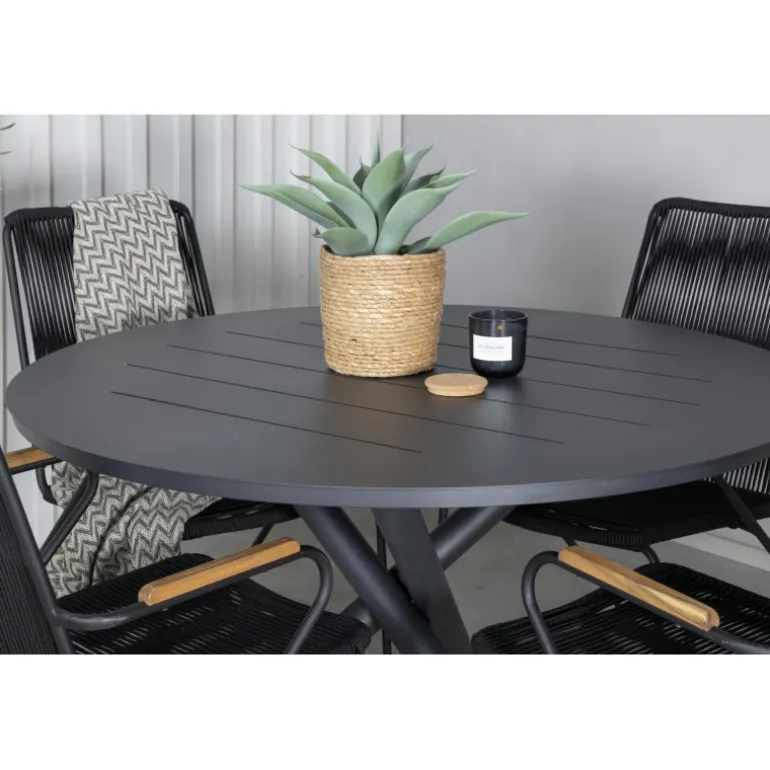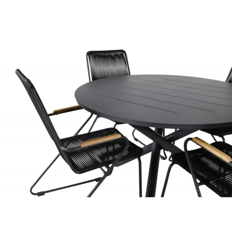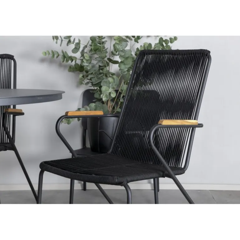 Bois, vores moderne, stilfulde og holdbare spisebordsstol, der passer til alle! Bois har et komfortabelt design med armlæn i teak og sort sæde i reb. Et møbel, der inviterer til mange hyggelige stunder. Her sammen med vores runde spisebord Alma i sort aluminium. Nyd ekstra dejlige måltider udendørs og indret terrassen i en stilfuld ånd!
