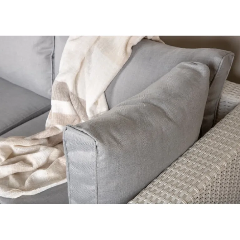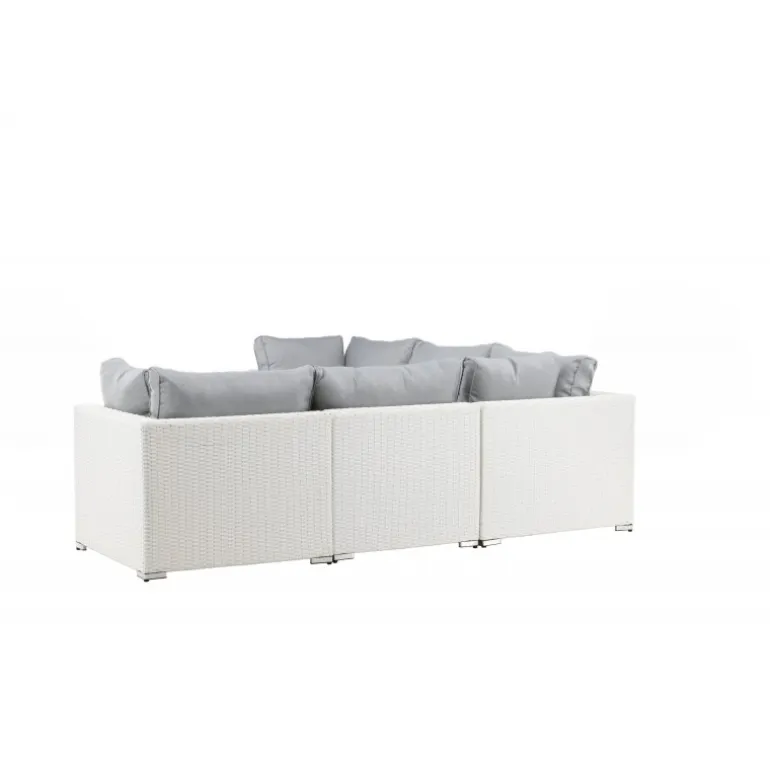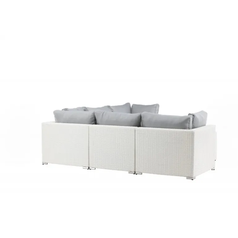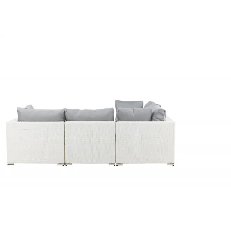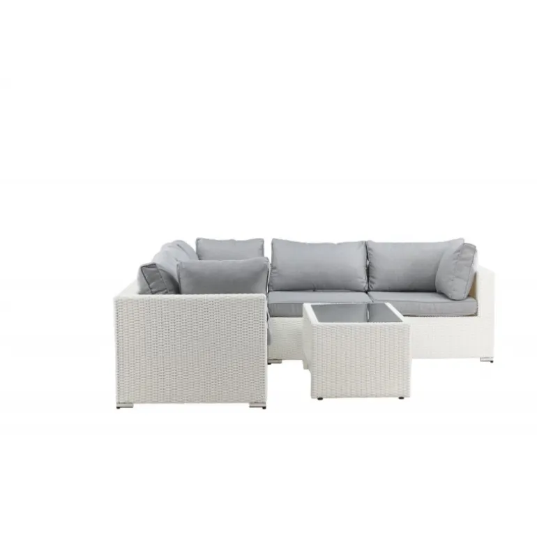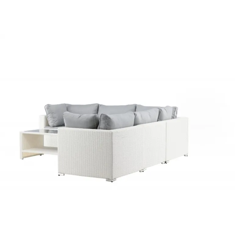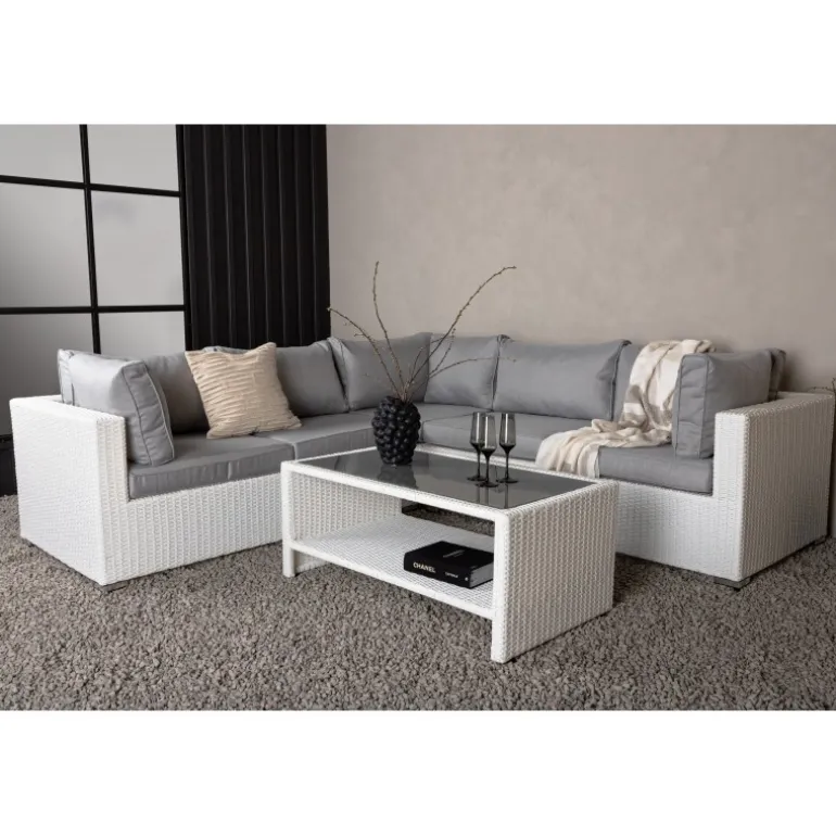 Amazon Hjørnesofa Sæt imponerer med sit moderne design, der fokuserer på god komfort til din terrasse eller patio. Sofaen består af en modulær hjørnesofa med fire sæder og en hjørnedel, som er let at samle, så den passer til dine behov. Bløde mørkegrå puder er inkluderet samt et matchende, lavt sofabord med en glasbordplade. Lavet af en metalramme og hvid kunstig rattan – to holdbare materialer, der er fremragende til udendørs brug! Gør dig klar til en fremragende sommeraften. Plejeråd: Konstriten er et plastmateriale, der er perfekt til vores skandinaviske klima. Materialet er UV-resistent og kan modstå vejr og vind. At det er UV-resistent betyder, at møblerne ikke falmer, men vi anbefaler altid at opbevare møblerne under møbelbeskyttelse eller ellers tørt og køligt for at forlænge levetiden.