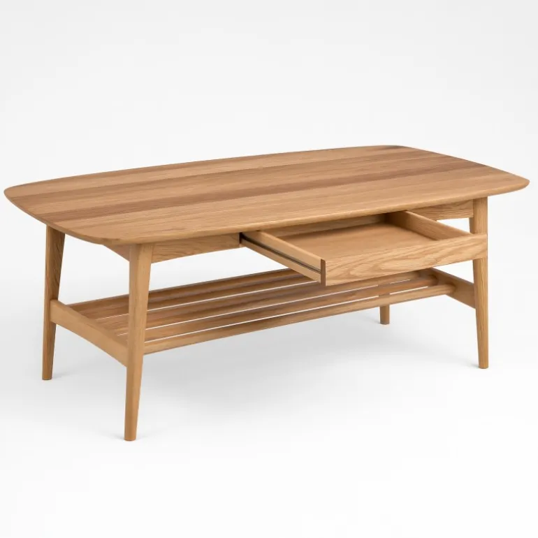 Den rummelige hylde under bordpladen er ideel til opbevaring af magasiner, bøger eller fjernbetjeninger, mens den integrerede skuffe giver ekstra plads til småting, du ønsker at have lige ved hånden men udenfor synsfeltet. Bordet står stabilt på fire koniske rektangulære ben i massivt eg med filtpuder, som beskytter gulvet.