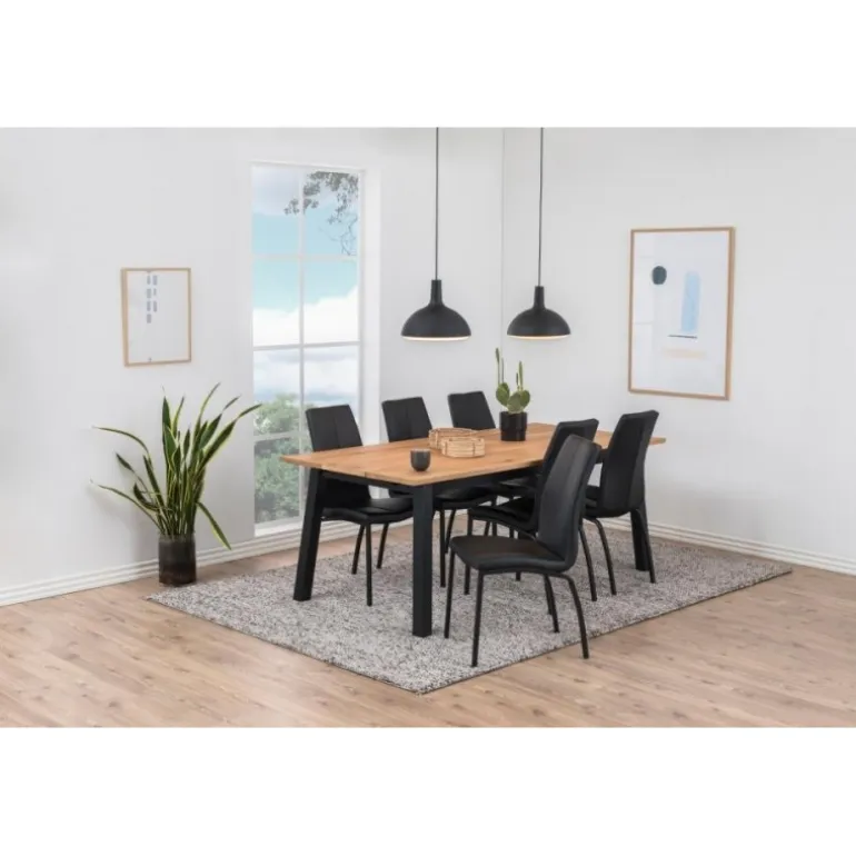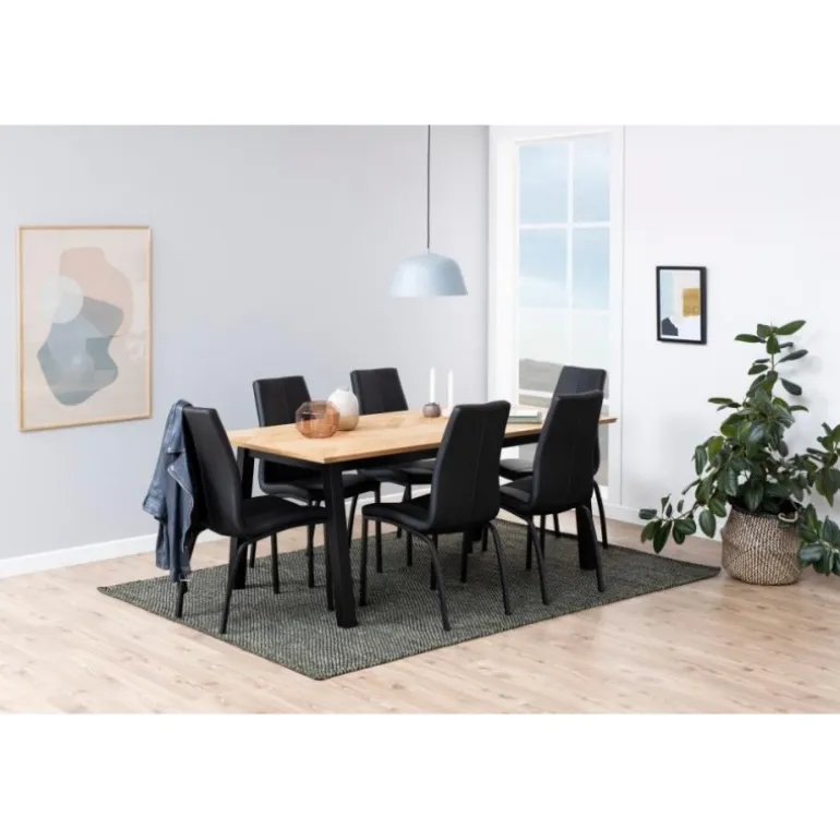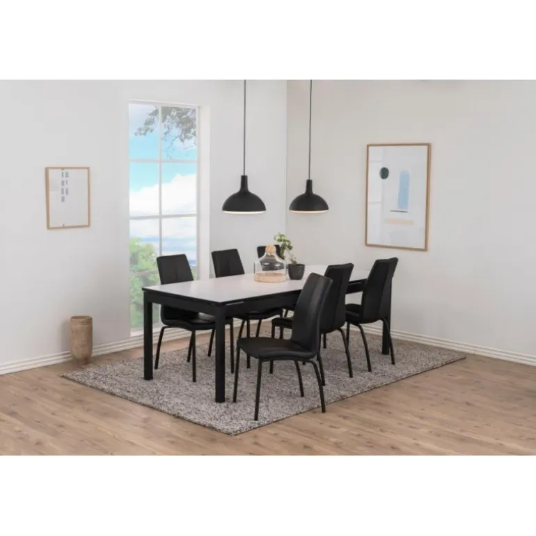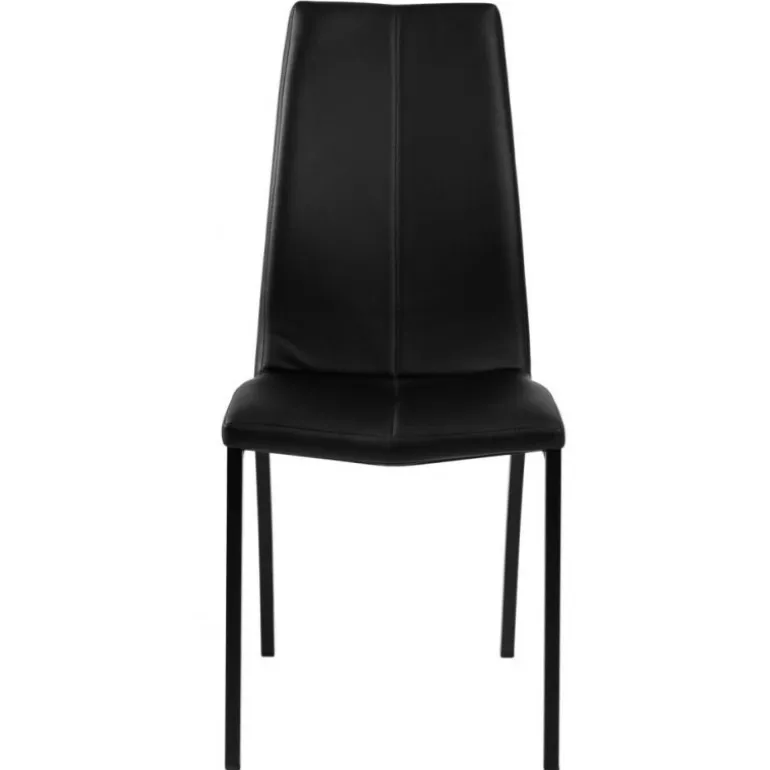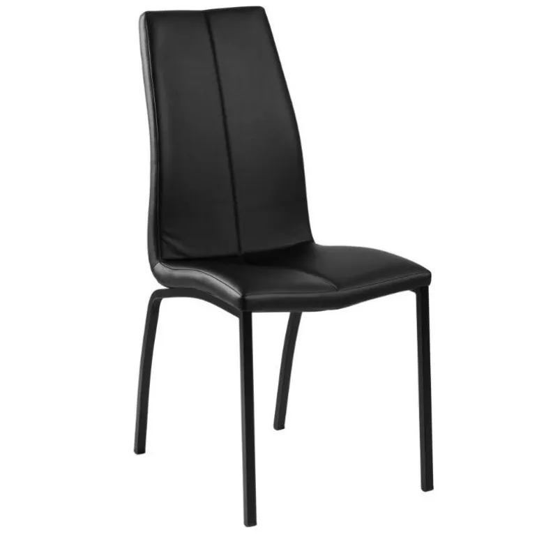 En elegant og stilrent spisebordsstol fra serien Stella. Kombinationen af stolens æderlook i sort PU og ben i sort metal, komplimenterer hinanden godt og giver en flot kontrast, som vil pynte i hjemmet. Pakning med 4 stk.
