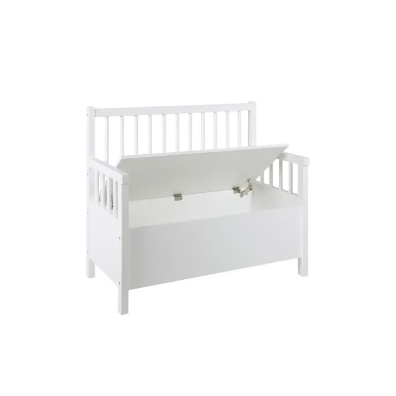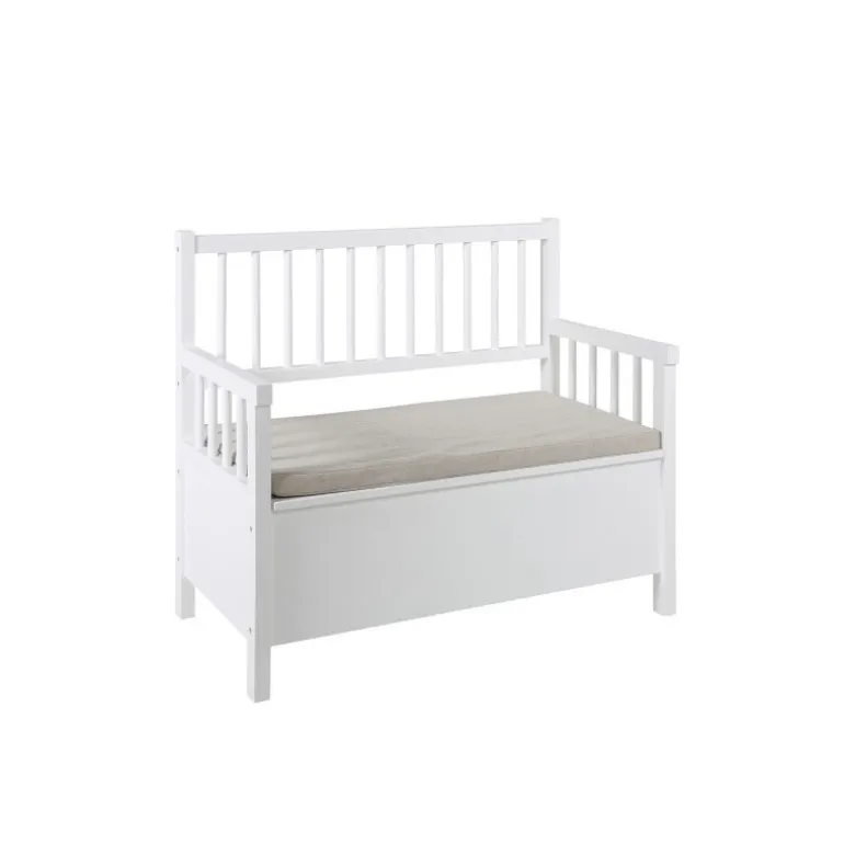 Flot stilren bænk i træ, behandlet med hvid lak ink. hynde i beige stof. Bænken tilfører et elegant design til dit hjem og er super funktioniel, i det den har et opbevaringsrum