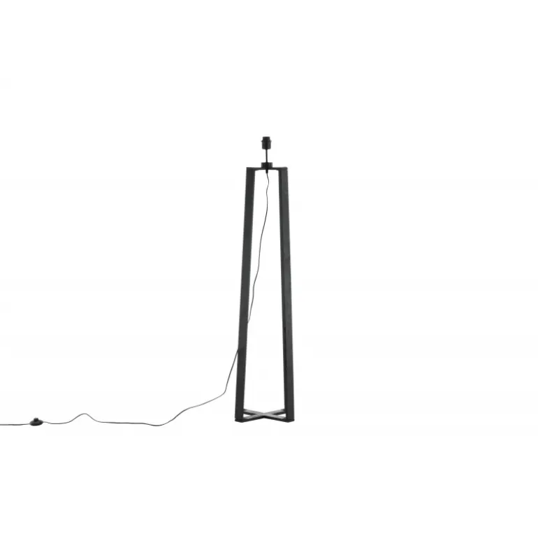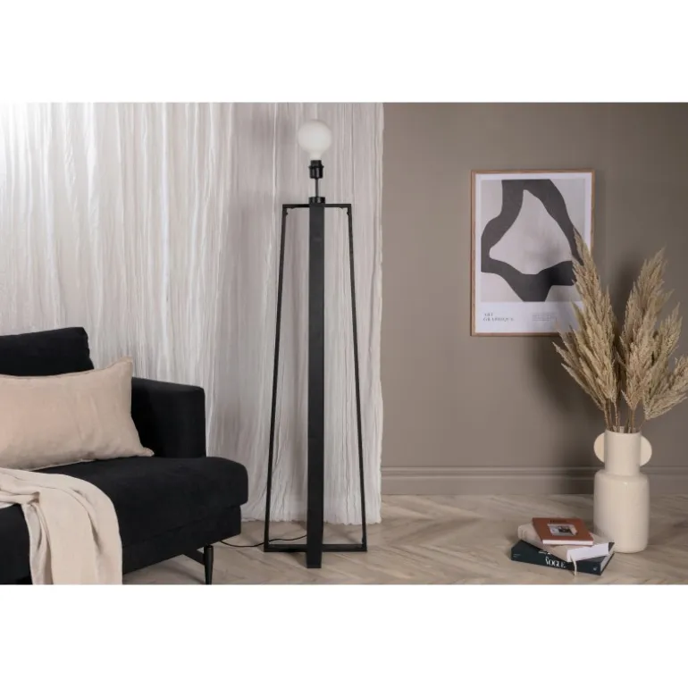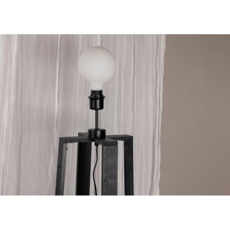 Tidløs gulvlampe i sort træ med krydsede ben. Ideel til soveværelset eller stuen. En lampe, der tiltrækker opmærksomhed med sit moderne design! Avspark Belysning er lavet af glas, PVC og stål, hvilket sikrer et holdbart og stilfuldt look. Perfekt til at tilføje et strejf af elegance til ethvert rum.