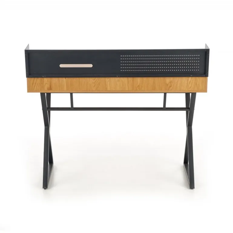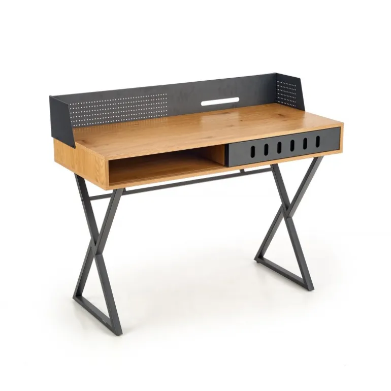 B43 Skrivebord er den ideelle løsning til dit kontor eller arbejdsområde. Med dimensionerne 110/51/90 cm, tilbyder dette skrivebord rigelig plads til dine arbejdsopgaver. Lavet af lamineret MDF og pulverlakeret stål, er det både robust og stilfuldt. Den gyldne eg og Sorte farvekombination giver et moderne og elegant look, der passer perfekt til enhver indretning.