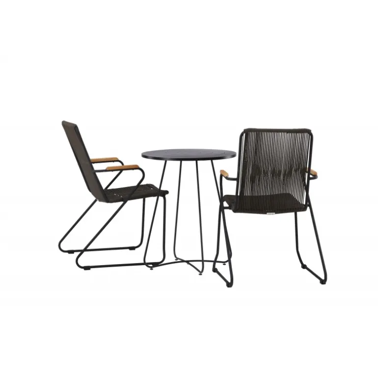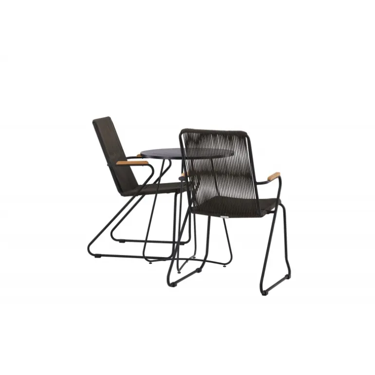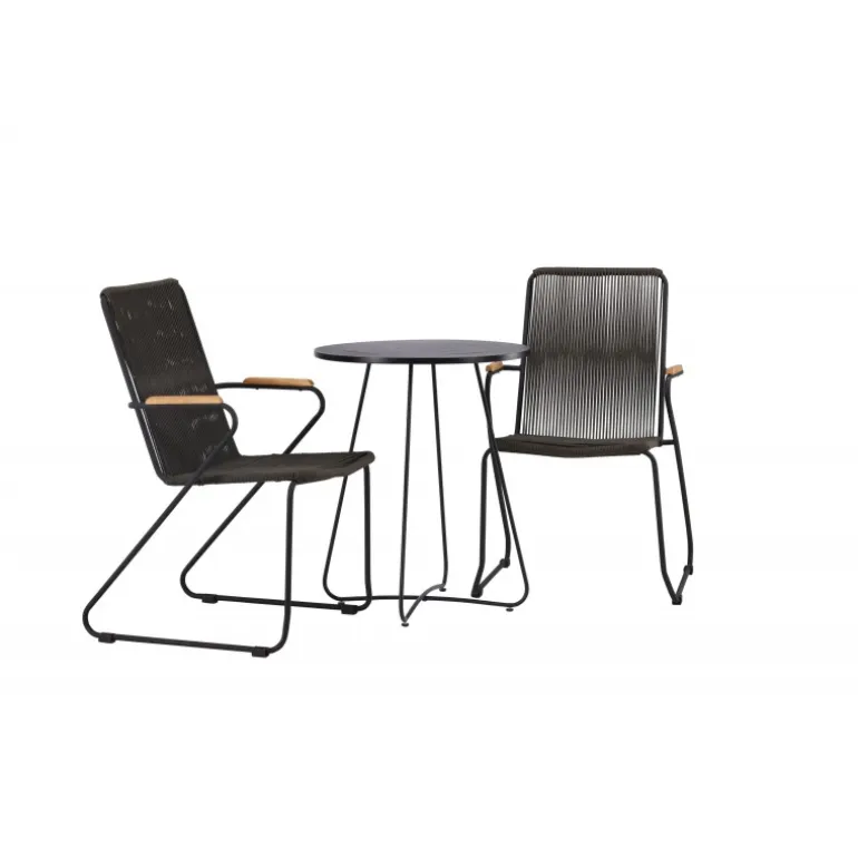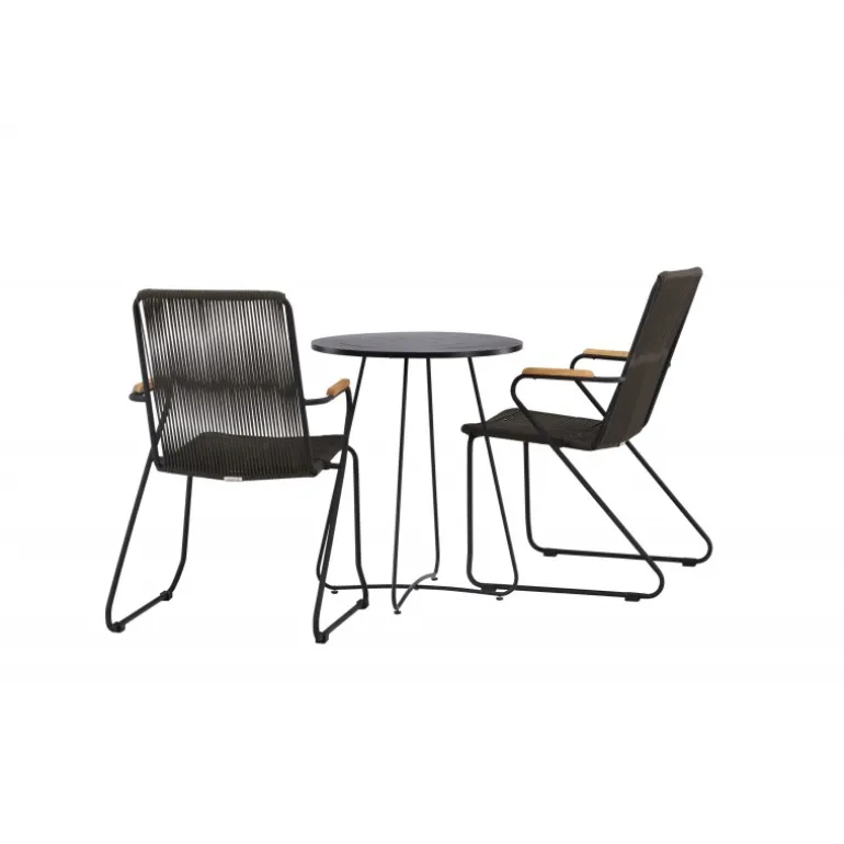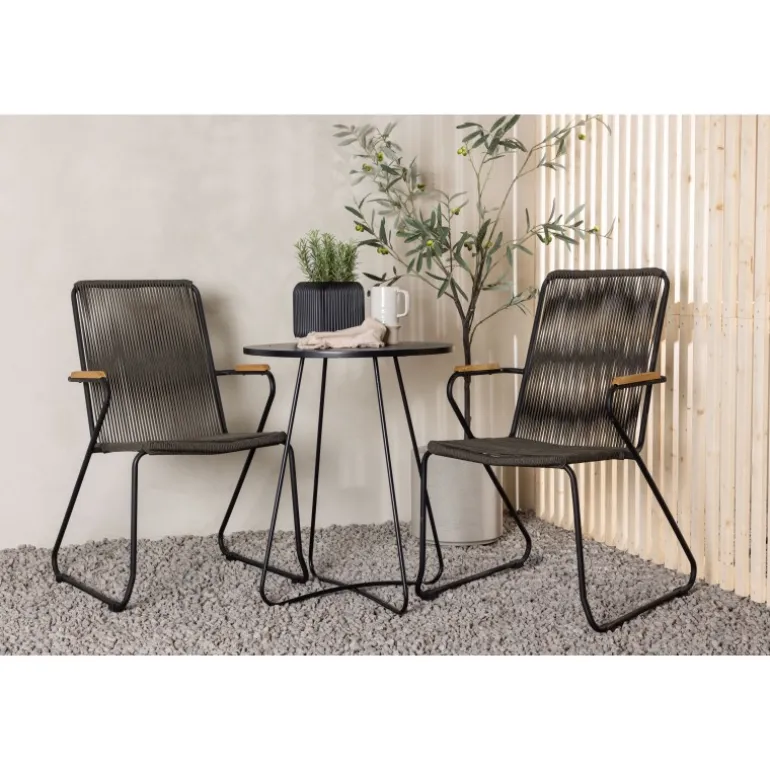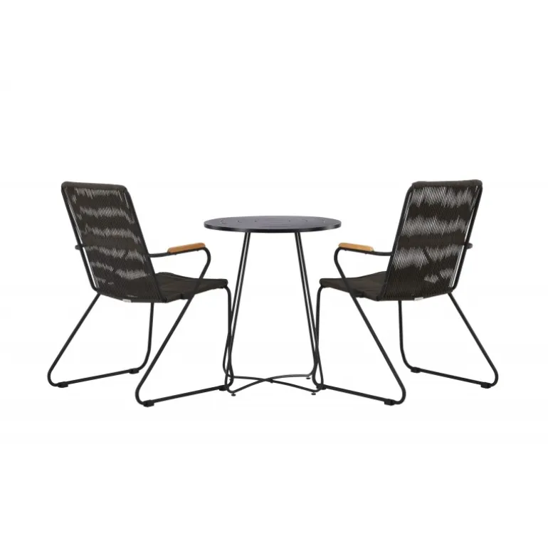 En fantastisk Loungesæt – Havemøbelsæt, der er perfekt til alle kaffepauser denne sommer! Den charmerende cafébord fra Bacong-serien har en rund bordplade og slanke ben i sort stål. Her sammen med 2 stilfulde spisebordsstole fra Bois-serien. Stolen har et komfortabelt design med armlæn i teak og mørkegrå sæde i reb. Sid behageligt og slap af denne sommer! Bordets diameter: 60 cm.
