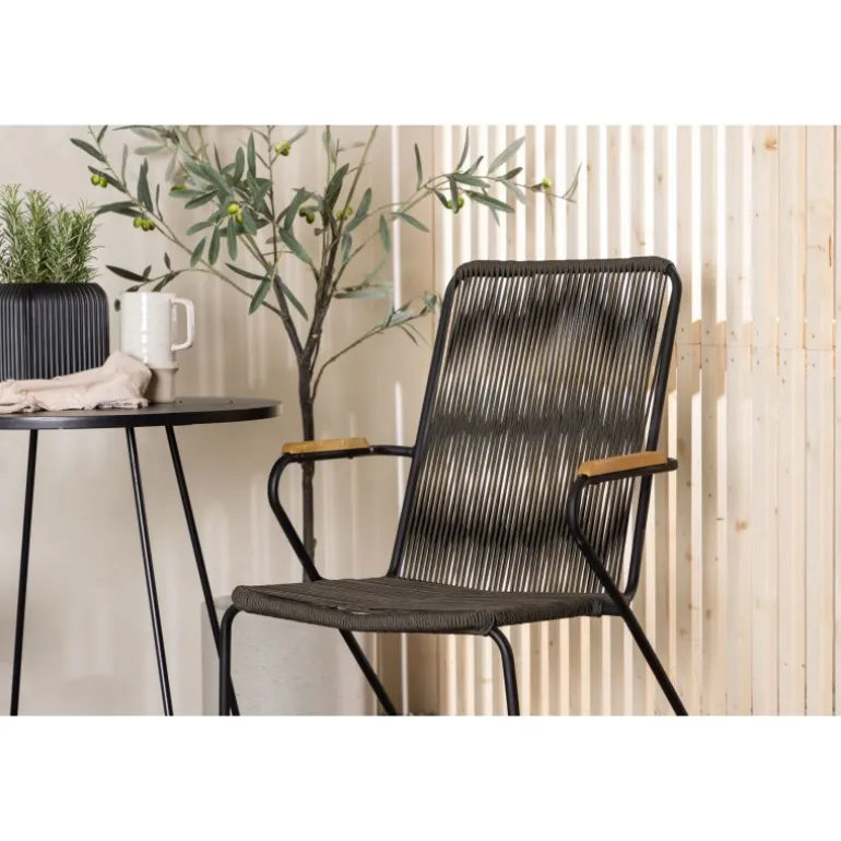 - Armlæn i teak og sæde i mørkegrå reb for ekstra komfort.