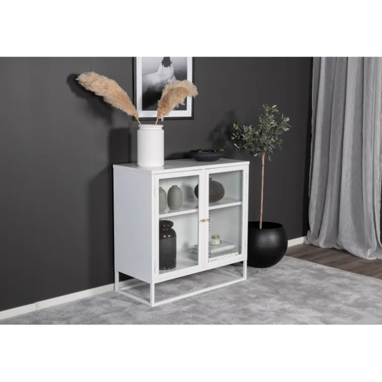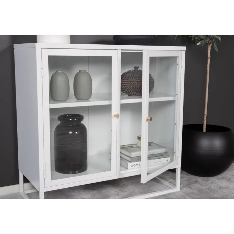 Bakal Kabinet i moderne industrielt design, fremstillet af hvid pulverlakeret stål med to glasdøre. En ramme af hvid pulverlakeret stål og to reliefoverflader. Dørene har messingfarvede knopper. Hele kabinettet hviler på en åben ramme i hvid pulverlakeret stål. Mål: Længde: 85 cm, bredde: 40 cm, højde: 85 cm. Lettere samling er påkrævet.