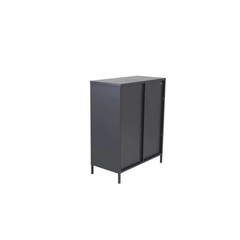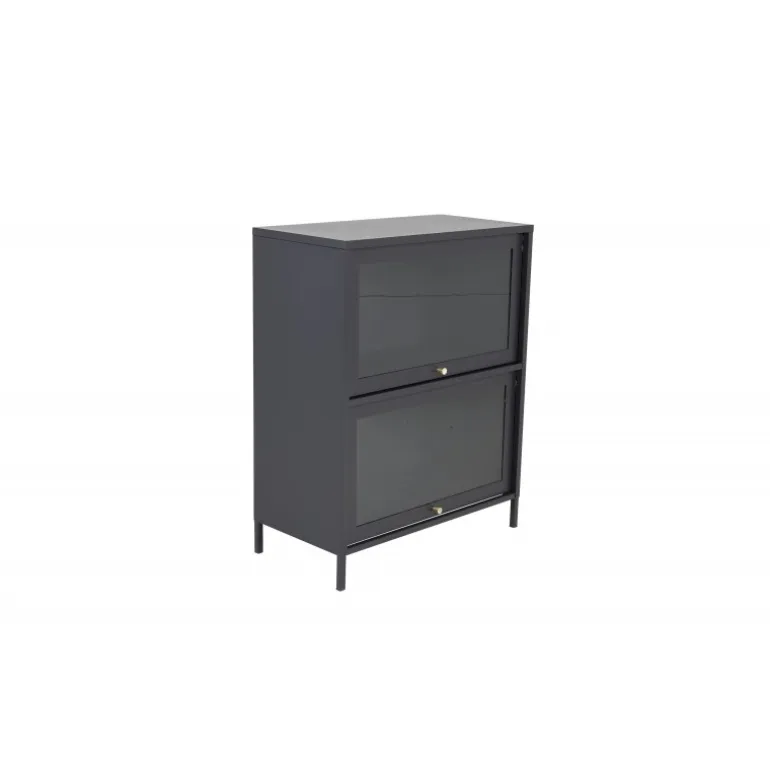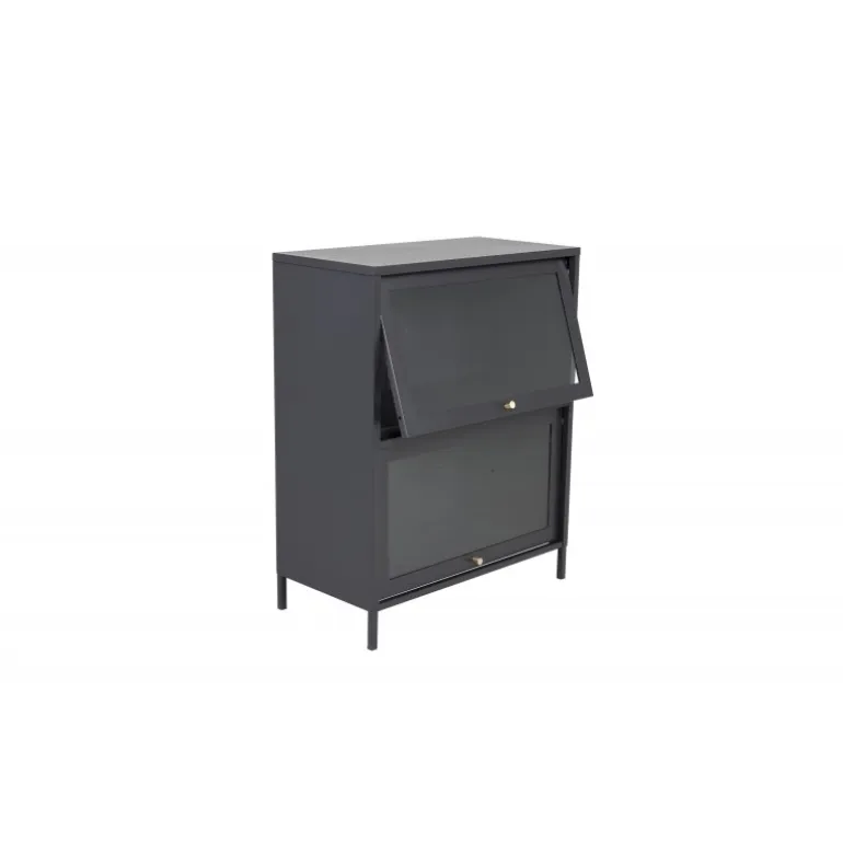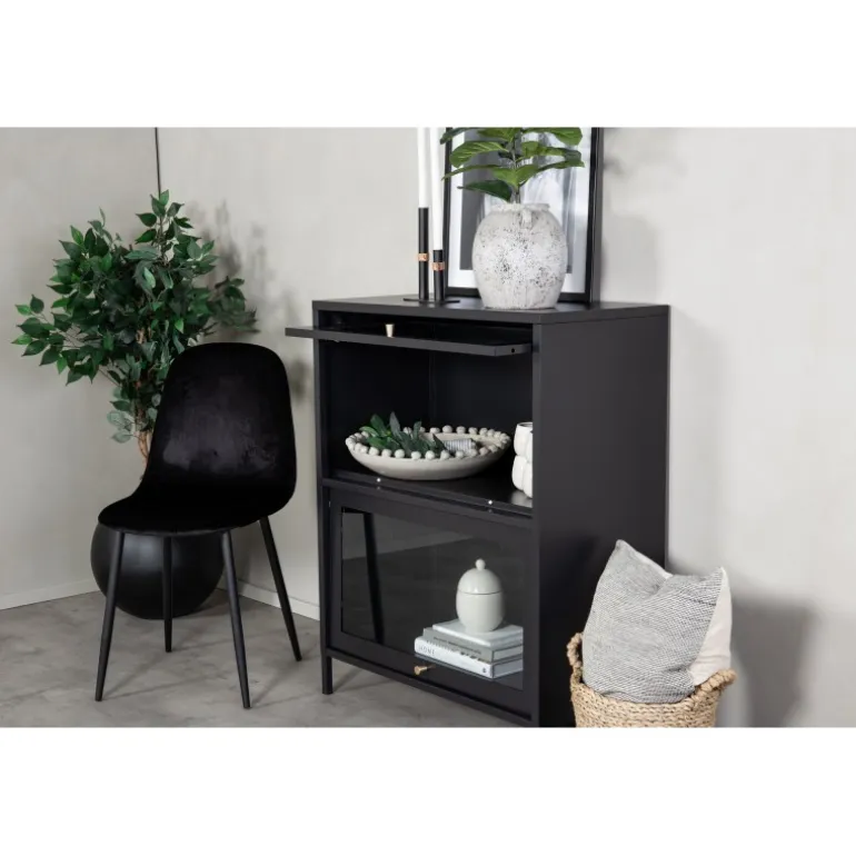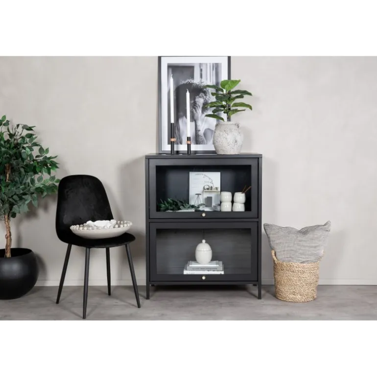 Oplev det trendy Bakal Kabinet, der er fremstillet i sort pulverlakeret stål med to glasdøre. Designet er gennemtænkt i en moderne industriel stil. De klare glasdøre lader et dejligt lys ind i skabet og er indrammet af sort pulverlakeret stål med detaljerede messingknopper. Glasdørene åbner opad. Udstillingsskabet hviler på fire smalle ben i pulverlakeret sort stål, hvilket giver skabet et luftigt udseende. Dimensioner: Længde: 80 cm, bredde: 40 cm, højde: 100 cm. Lettere samling kræves. Et elegant opbevaringsmøbel, som du kan fylde med alt fra smukt porcelæn til bøger og stilfulde interiørdetaljer. Plejeanvisning: Aluminium og krom er to materialer, der afviser snavs og væsker. Vær dog opmærksom på, at vand kan forårsage pletter og rust. Sørg derfor for at tørre overfladen af med en blød, fugtet klud og sæbevand. Hvis pletter eller rust sidder for hårdt fast, anbefales det at bruge en blød klud fugtet i ren alkohol.