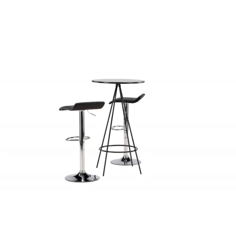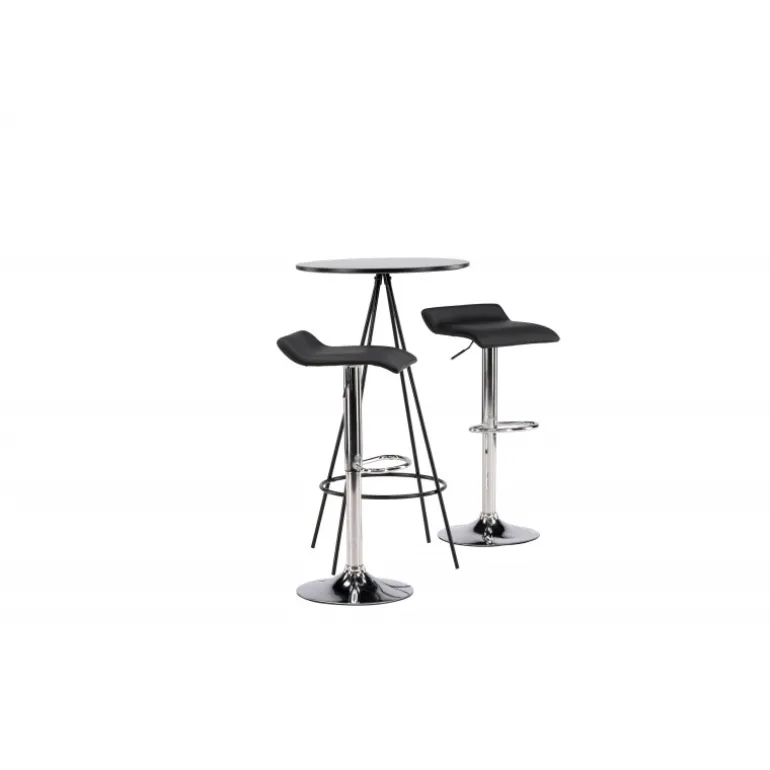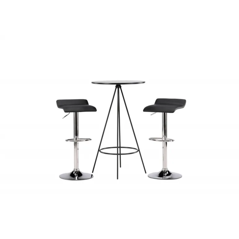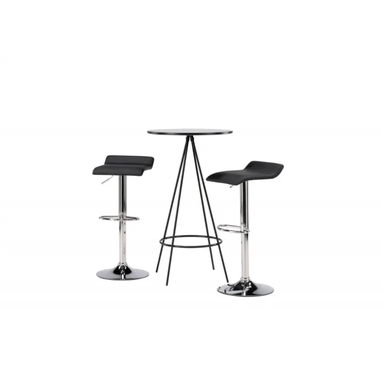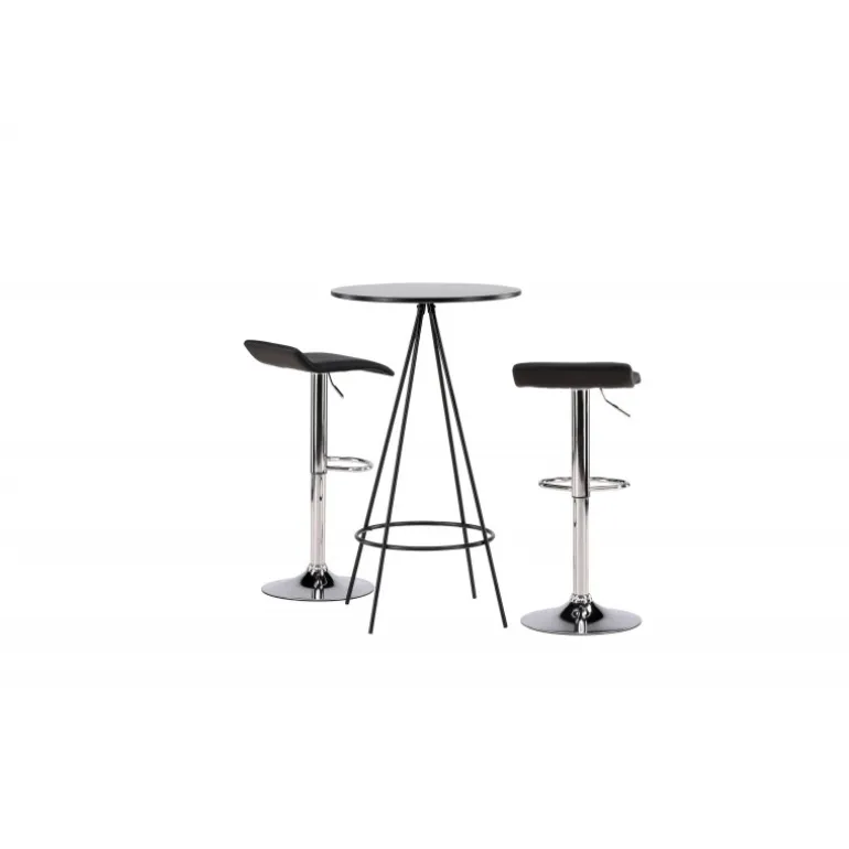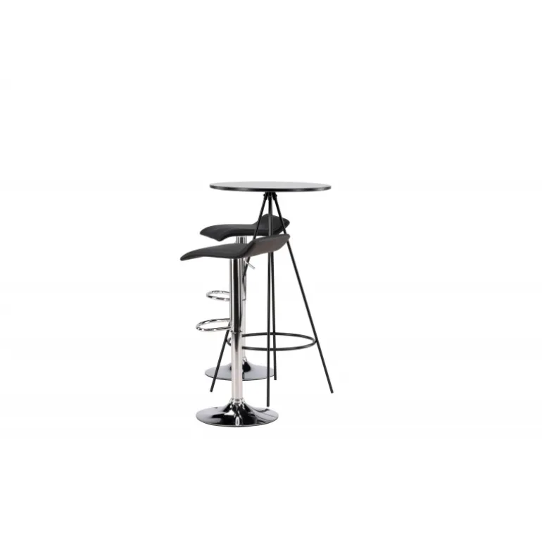 Trendy bargruppe med alle de rette funktioner! Bistro barbordet har et minimalistisk, skandinavisk design med en rund bordplade i sort MDF med finer. De luftige, kegleformede bordben er let udvidet i sort metal og har en integreret ramme til fodstøtte. Her i kombination med sorte barstole fra Jonna-serien. Stolen har et stilfuldt design med en trompetfod i kromet stål og et enkelt sæde i sort kunstlæder. Det bliver ikke bedre end dette! Bordmål: 60 cm.