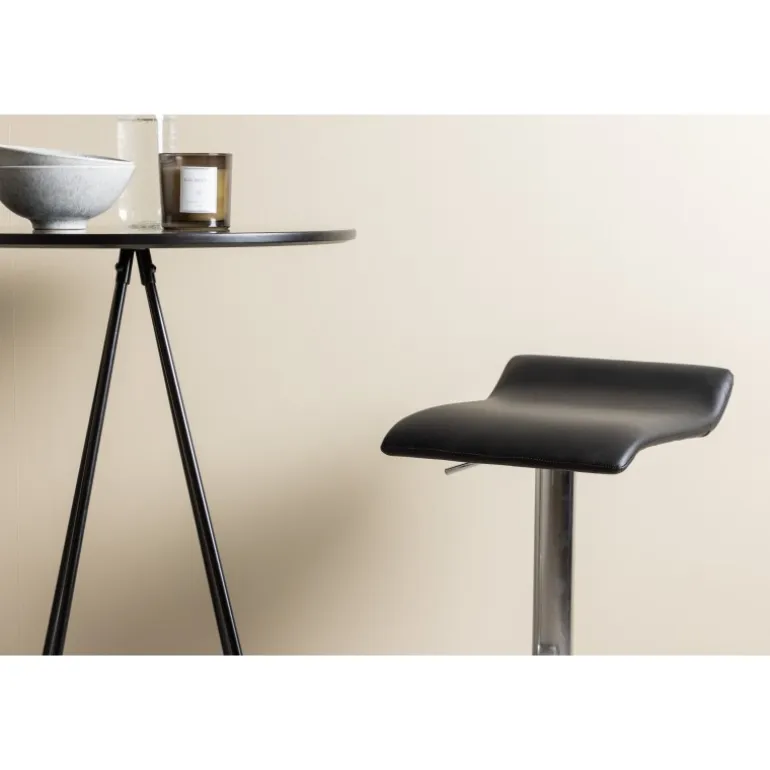 - Kombineret med Jonna barstole: Stilfulde stole med trompetfod i kromet stål og sæde i sort kunstlæder.