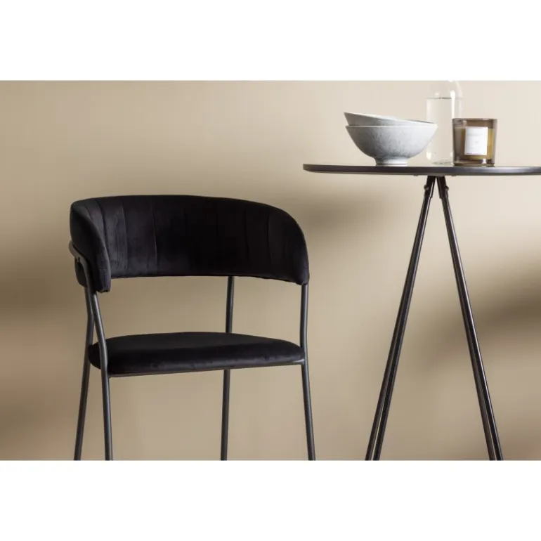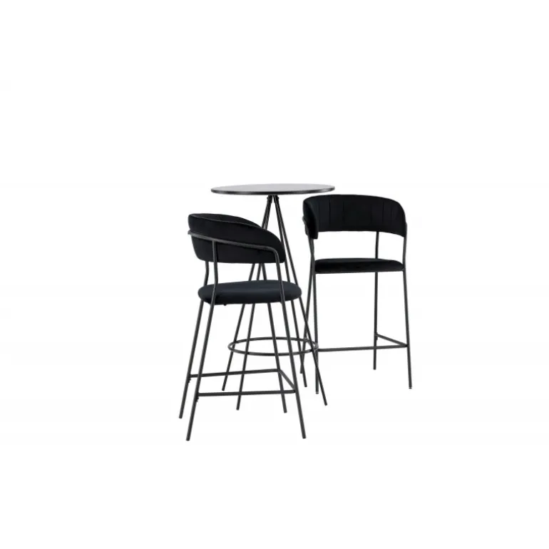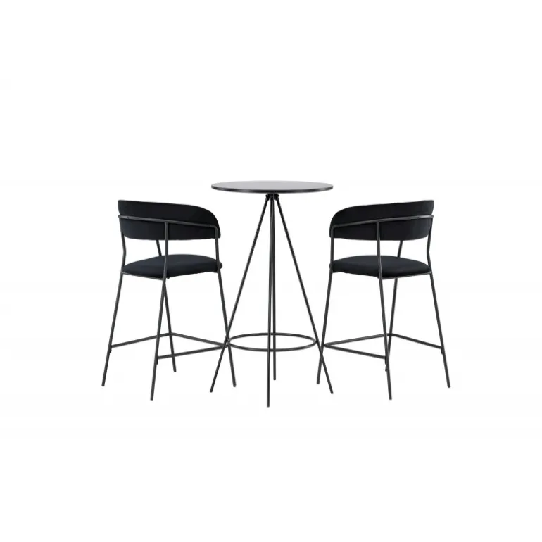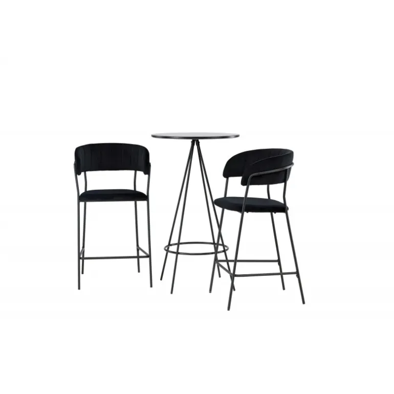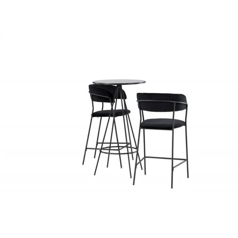 Det bliver ikke bedre end dette! Bistro barbordet har et minimalistisk, skandinavisk design med en rund bordplade i sort MDF med finér. De luftige, kegleformede bordben er let udadbuede i sort metal og har en integreret ramme til fodstøtten. Her i stilfuld kombination med komfortable barstole fra Lui-serien. Stolen har et fuldt polstret design med en let rundet ryg og sæde i kunstlæder med stilfulde dekorative syninger, og stolens ben er smalle i sort stål med integreret fodstøtte – garanteret lige så stilfuld som komfortabel. Bordets dimensioner: 60 cm.