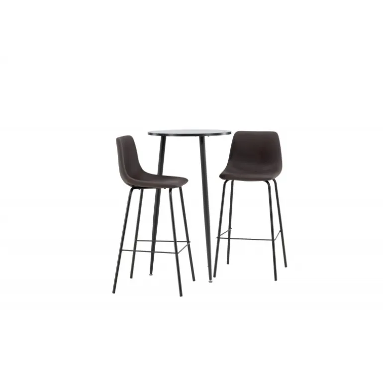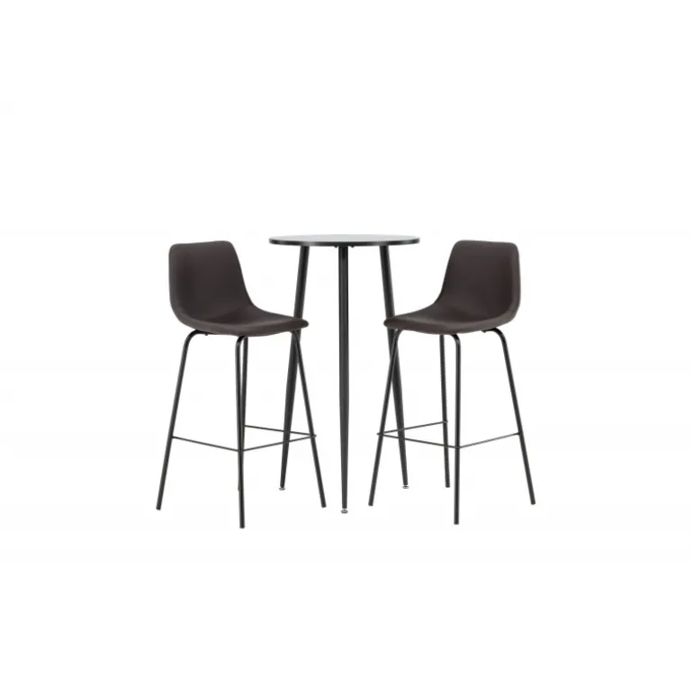 Oplev komfort og stil med vores Bar sæt Plaza med stole Alexi. Dette elegante barbord har en rund bordplade i sort MDF og let udskårne ben i sort metal. Sættet kommer med brune barstole fra Alexi-serien, som er fuldt polstret i brun polyurethanlæder og polyester. De smalle ben i sort pulverlakeret metal har en integreret fodstøtte for ekstra komfort. Gør dit hjem smart og moderne! Bordets dimensioner: 60 cm i diameter.