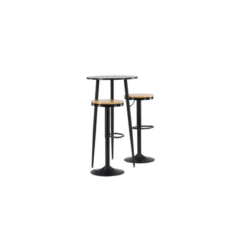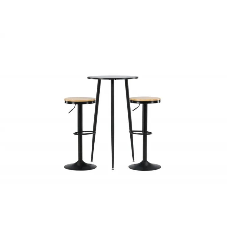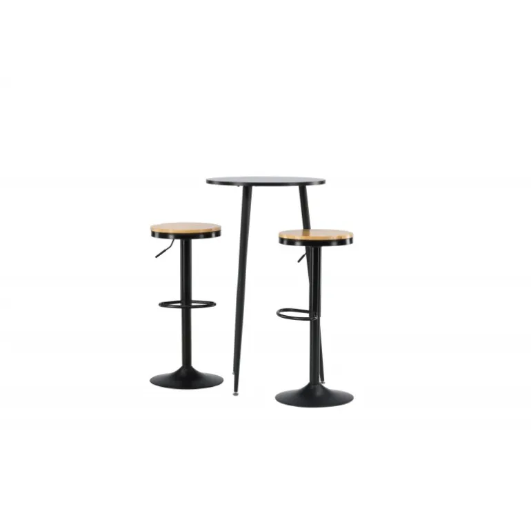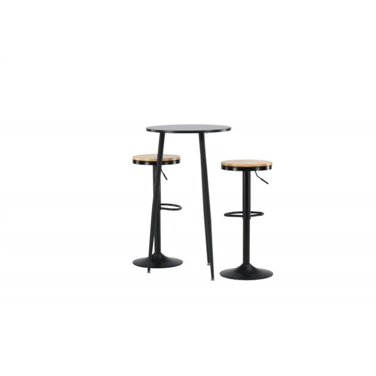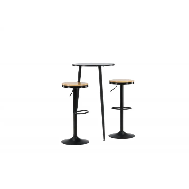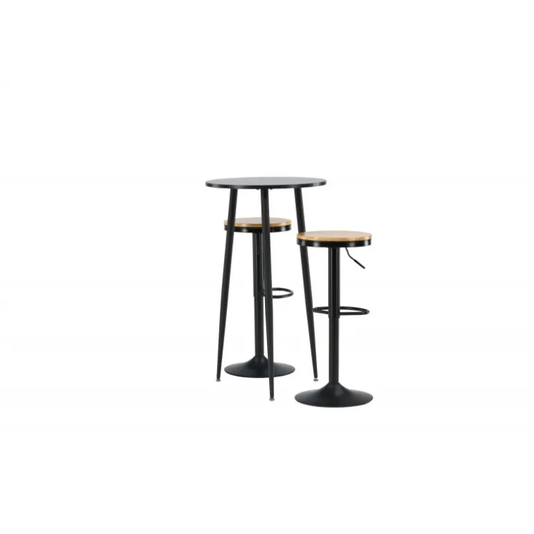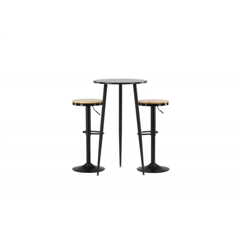 Et perfekt barsæt til det lille køkken! Den vidunderlige Plaza barbord har en rund bordplade i sort MDF, og bordbenene er let udadvendte i sort metal. Her sammen med enkle barstole fra Conway-serien. Stolen har et stilfuldt design med en trompetfod i sort stål og en enkel rund sæde i egetræsfineret MDF. Denne barstol har integreret fodstøtte og kan hæves og sænkes for ekstra komfort. Så smart som den er stilfuld! Borddimensioner: 60 cm.