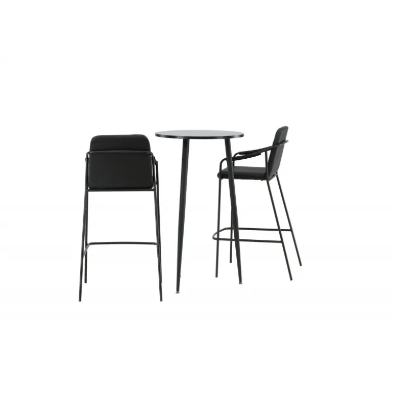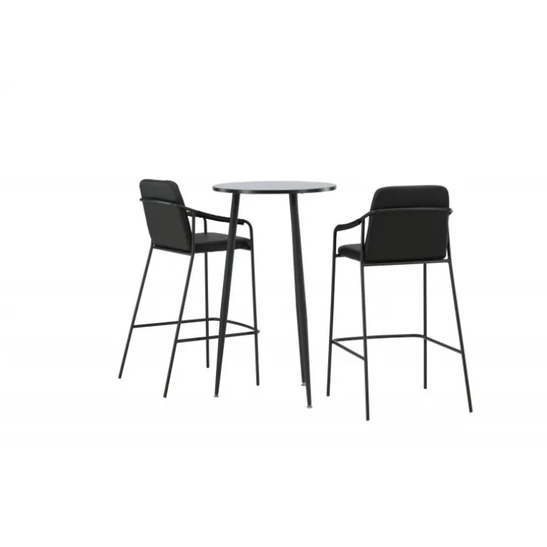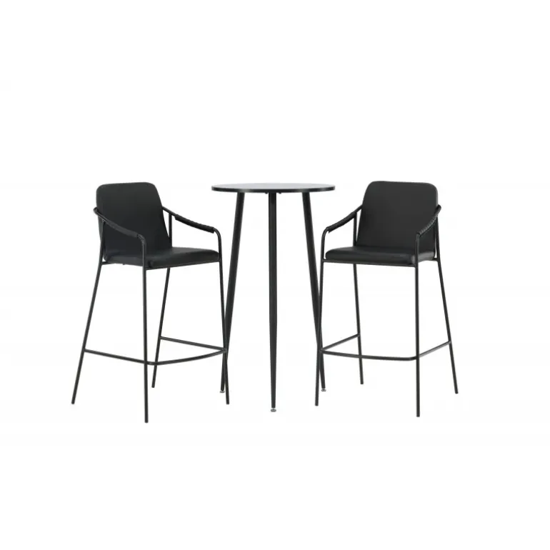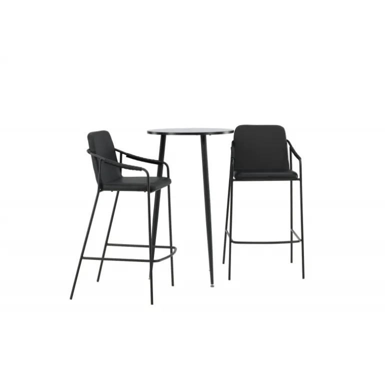 En næsten uovertruffen kombination til det lille køkken! Det vidunderlige Plaza barbord har en rund bordplade i sort MDF, og benene er let skråtstillede i sort metal. Her sammen med sorte barstole fra serien Tvist. Stolen har et polstret sæde og fuldt polstret design i sort PU med minimalistiske stoleben og integrerede armlæn i sort stål. Simpelthen lige så stilfuldt som smart! Bordets diameter: 60 cm.