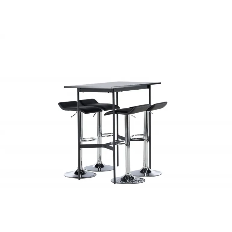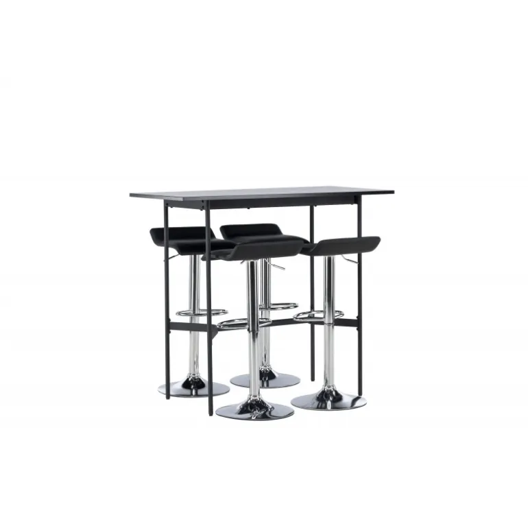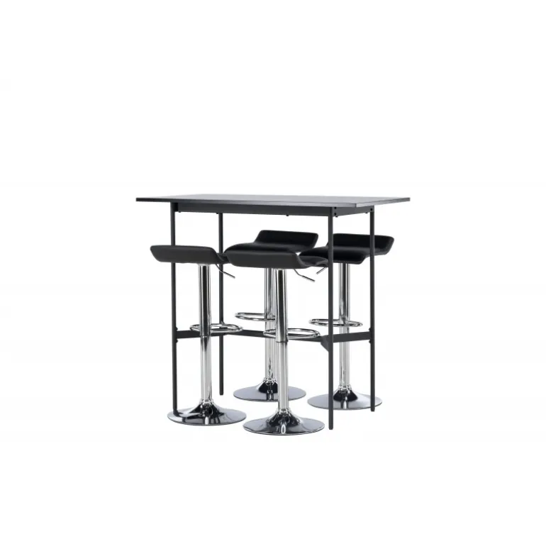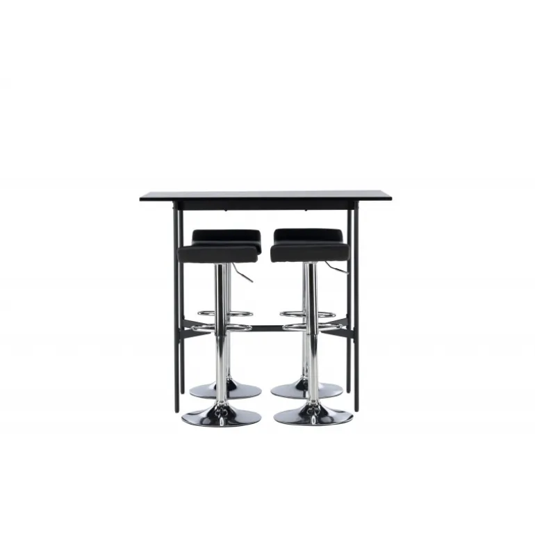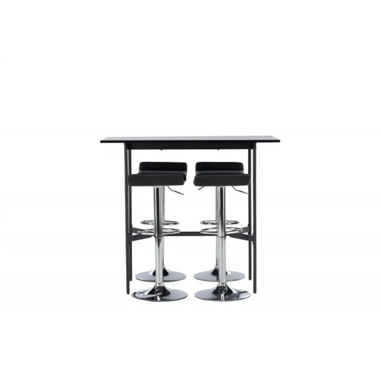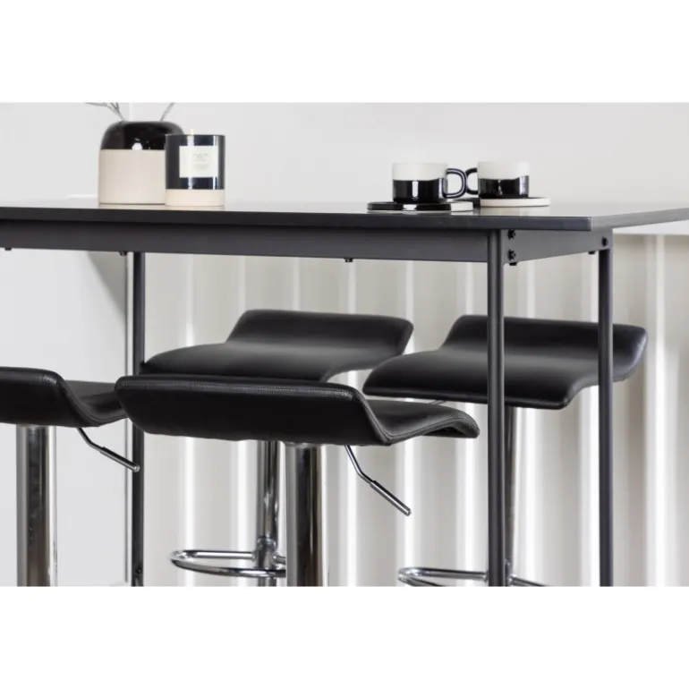 Et strømlinet barsæt med et trendy design! Det minimalistiske barbord Rax har en tynd bordplade i sort MDF og slanke bordben med integreret fodstøtte i sort metal. Her i kombination med sorte barstole fra Jonna-serien. Stolen har et stilfuldt design med en trompetfod i forkromet stål og et enkelt sæde i sort kunstlæder. Tag din indretning til nye højder! Bordmål: 120x60cm.