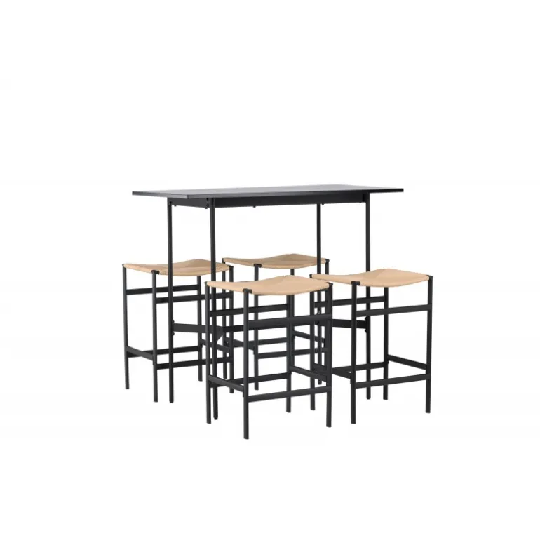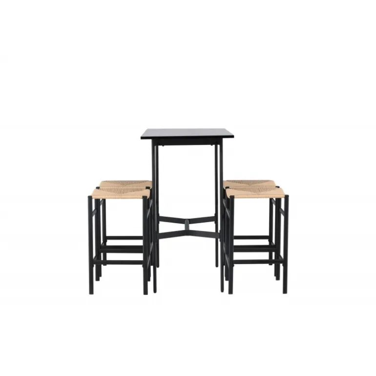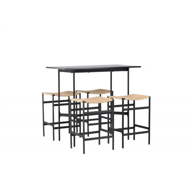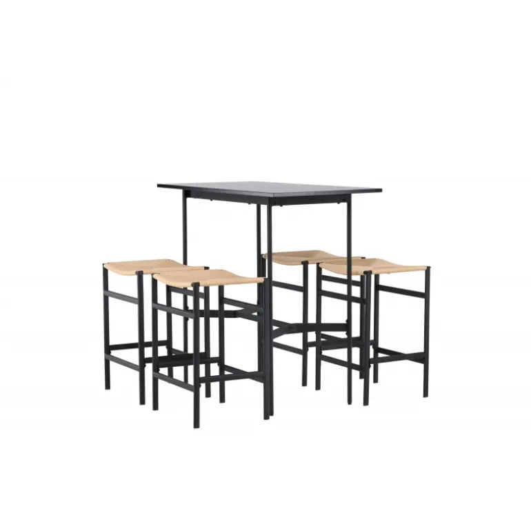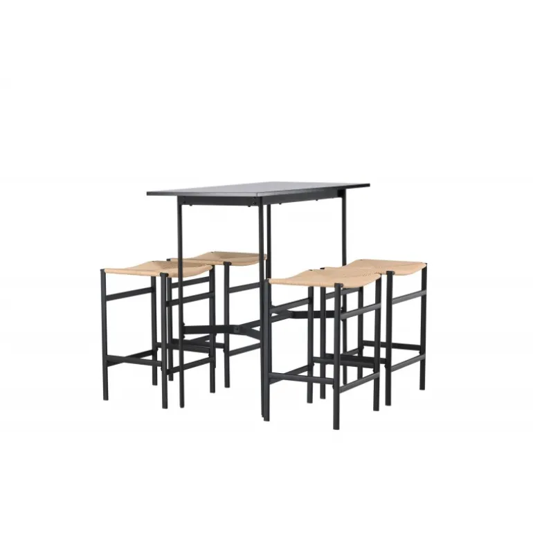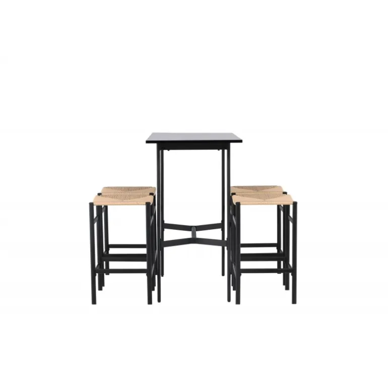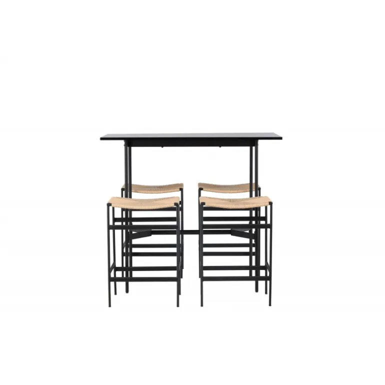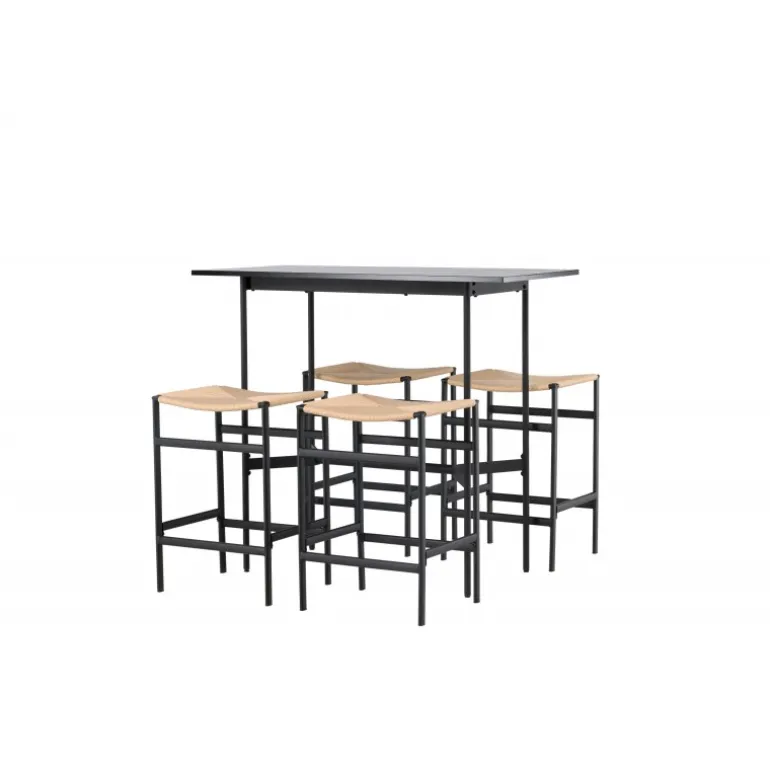 Oplev en stilfuld kombination af boheme og industrielt design med vores bar sæt Rax med stole Polly! Det minimalistiske barbord Rax har en tynd bordplade i sort MDF og smalle bordben med integreret fodstøtte i sort metal. Hertil får du moderne barstole fra Polly-serien. Stolen har en smart farvekombination med sæde i naturfarvet reb og lige ben med integreret fodstøtte i sort gummitræ. Hvilket utroligt match! Bordmål: 120×60 cm.