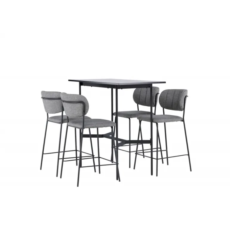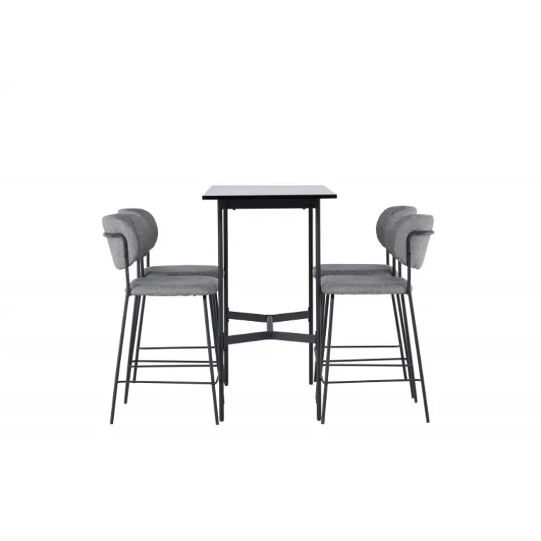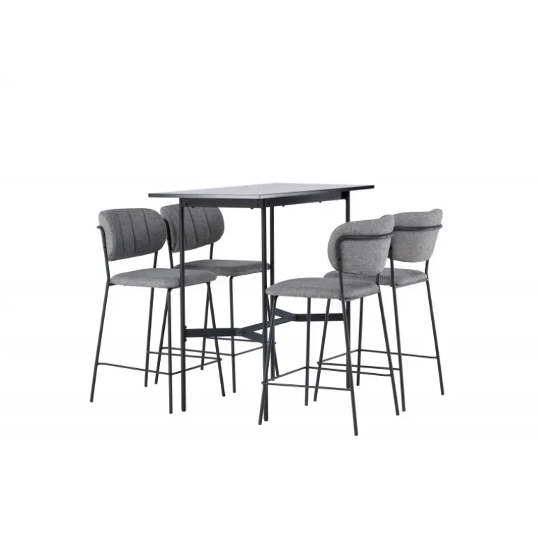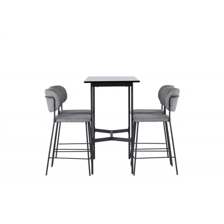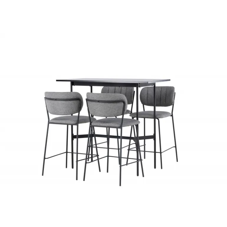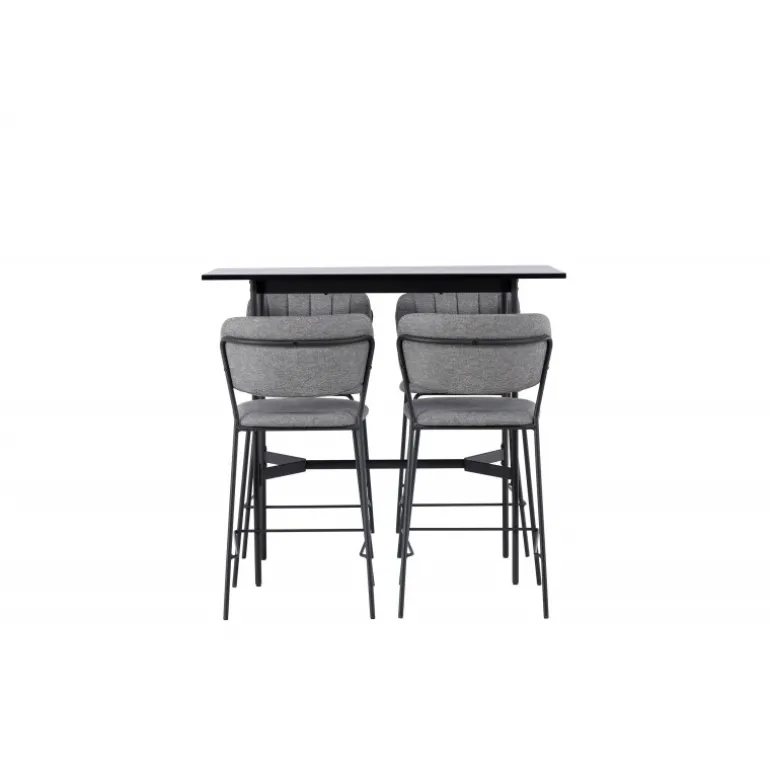 Stilfulde former og skandinavisk design – en perfekt kombination! Det minimalistiske barbord Rax har en tynd bordplade i sort MDF og smalle bordben med integreret fodstøtte i sort metal. Her sammen med grå barstole fra Bell-serien. Stolen har et fuldt polstret design med en let afrundet ryg og sæde i gråt polyesterstof med stilfulde dekorative syninger, og stolebenene er smalle i sort stål med integreret fodstøtte. Det bliver næppe bedre end dette! Bordmål: 120x60cm.